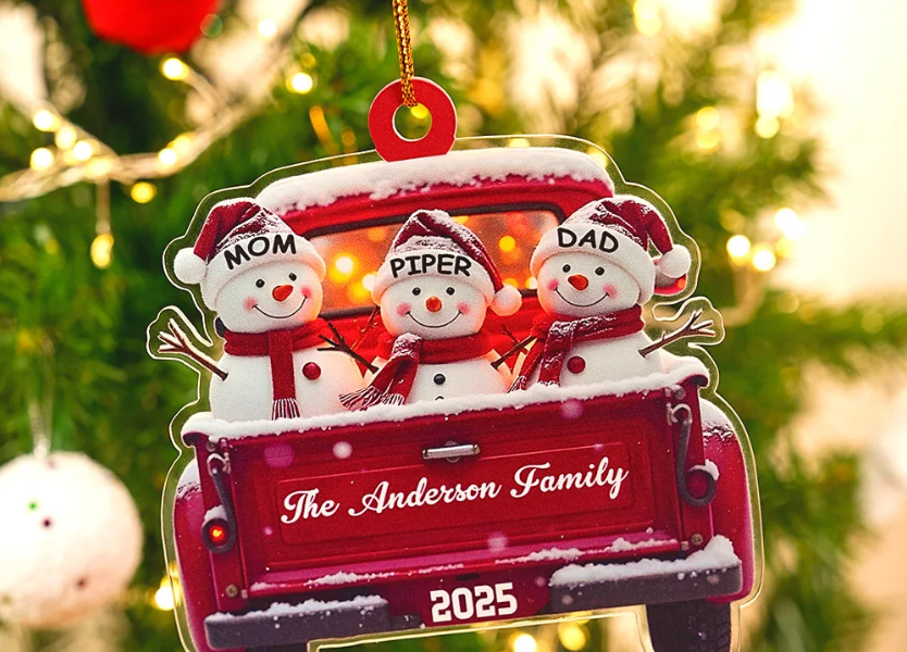 Henkilökohtainen söpö lumiukko punaisessa kuorma-autossa Perheen joulukoriste, jossa on 3-6 nimeä ja vuosi Joulukuusen sisustus Juhlalahja perheelle ystäville
