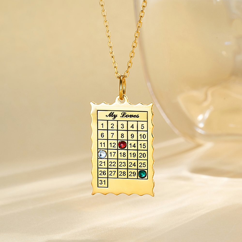 Tämä kaulakoru on täydellinen sekoitus eleganssia ja tunnetta. Siinä on kimalteleva syntymäkivi ja pieni kalenteri, saatavana platinaa, kultaa ja ruusukultaa. Kun valitset syntymäkivesi kuukauden, kaulakoru asetetaan vastaavaan päivämäärään, jolloin perheesi tärkeät päivämäärät näkyvät selvästi. Voit muokata tekstiä, kuten nuo kimaltelevat syntymäkivet, muistuttamaan sinua näistä erityisistä päivistä ja pitämään ne sydämessäsi.