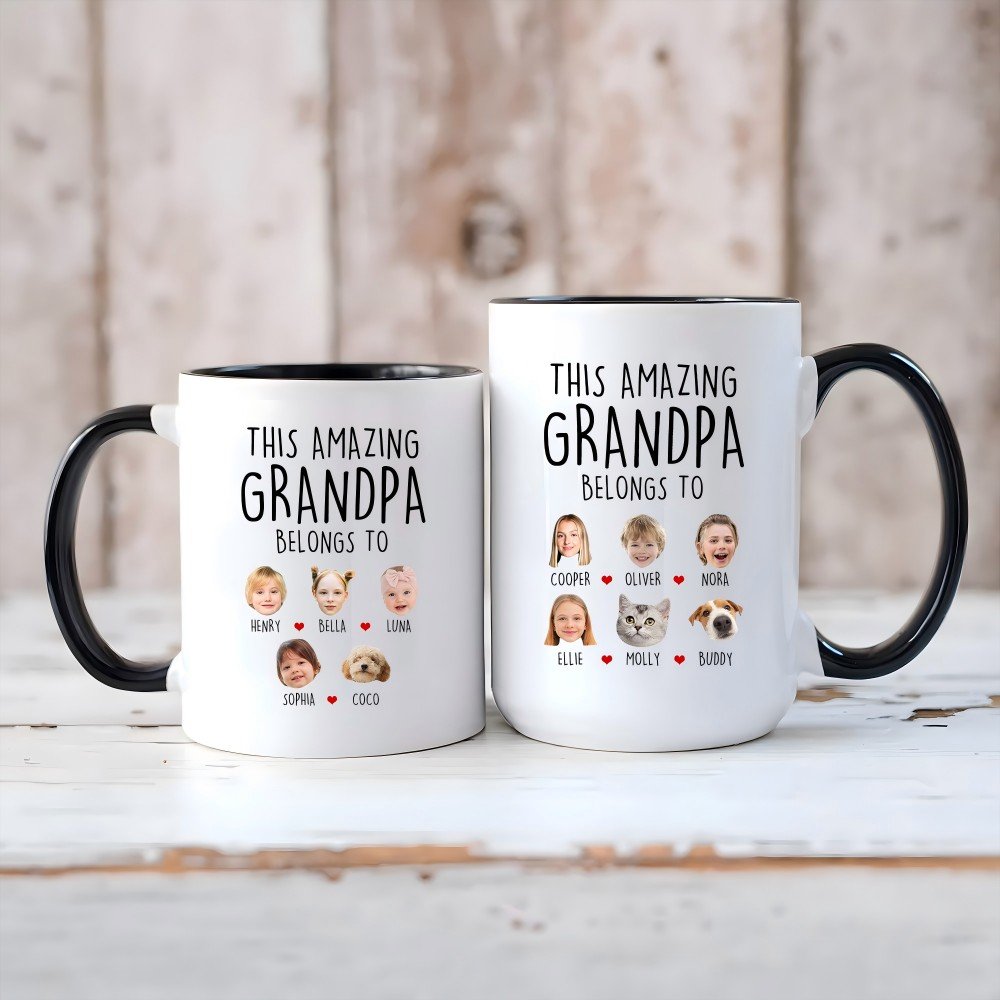 Tämän mukin muotoilussa on rakkautta. "THIS AMAZING GRANDPA BELONGS TO" on painettu mukiin, ja lempinimet voidaan räätälöidä perheenjäsenten mukaan, kuten "DAD" tai "PAPA". Voit myös ladata 1-12 perheenjäsenen avatarit ja yhdistää nimet ja valokuvat punaisilla sydänkuvioilla, jotta jokainen kulaus juomasta on täynnä perheen lämpöä.