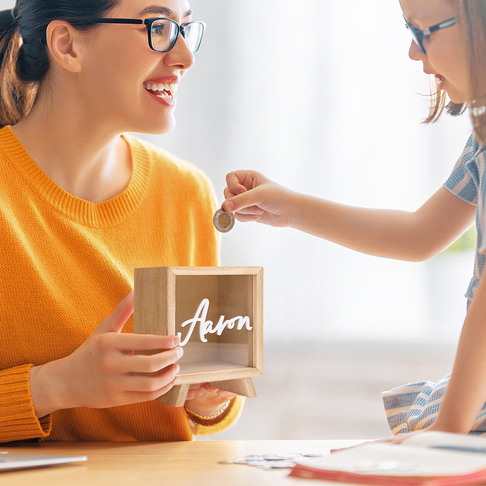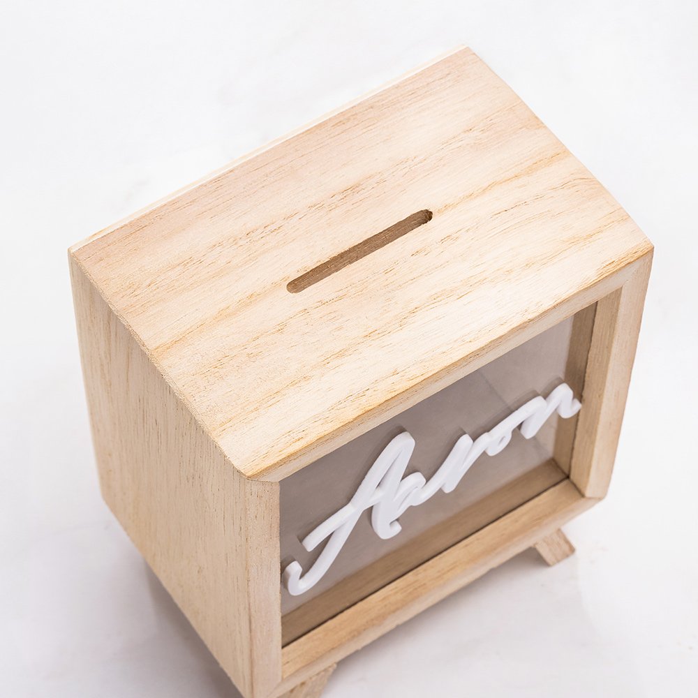Rahalaatikko erottuu edukseen ainutlaatuisella muotoilullaan. Siinä on kauniisti muotoiltu puinen ulkokuori, jota täydentää vastaanottajan nimikirjaimet tai nimi akryylin 3D-efektillä. Tämä mukautettu kosketus muuttaa perinteisen säästöpossun arvokkaaksi muistoesineeksi, joten se sopii täydellisesti mihin tahansa tilaisuuteen.