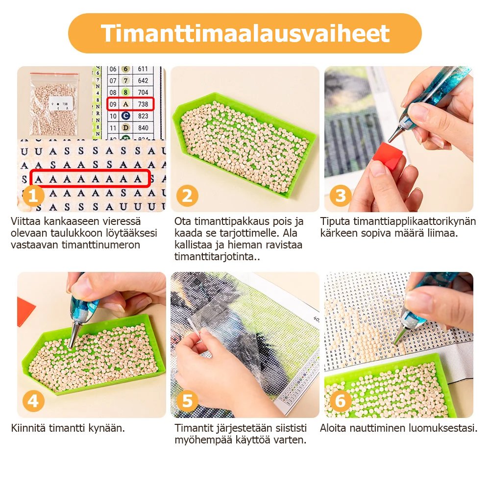 Setti sisältää personoidun kankaan ja runsaasti hartsitimantteja. Jokaisessa pakkauksessa on noin 20–30 prosenttia ylimääräisiä timantteja jotta voit luoda huoletta ilman pelkoa materiaalin loppumisesta. Mukana on myös kaksi vaaleanpunaista timanttimaalauskynää yksi nelipäinen asetin yksi seitsemänpäinen asetin yksi tarjotin sekä neljä kappaletta liimavahaa.