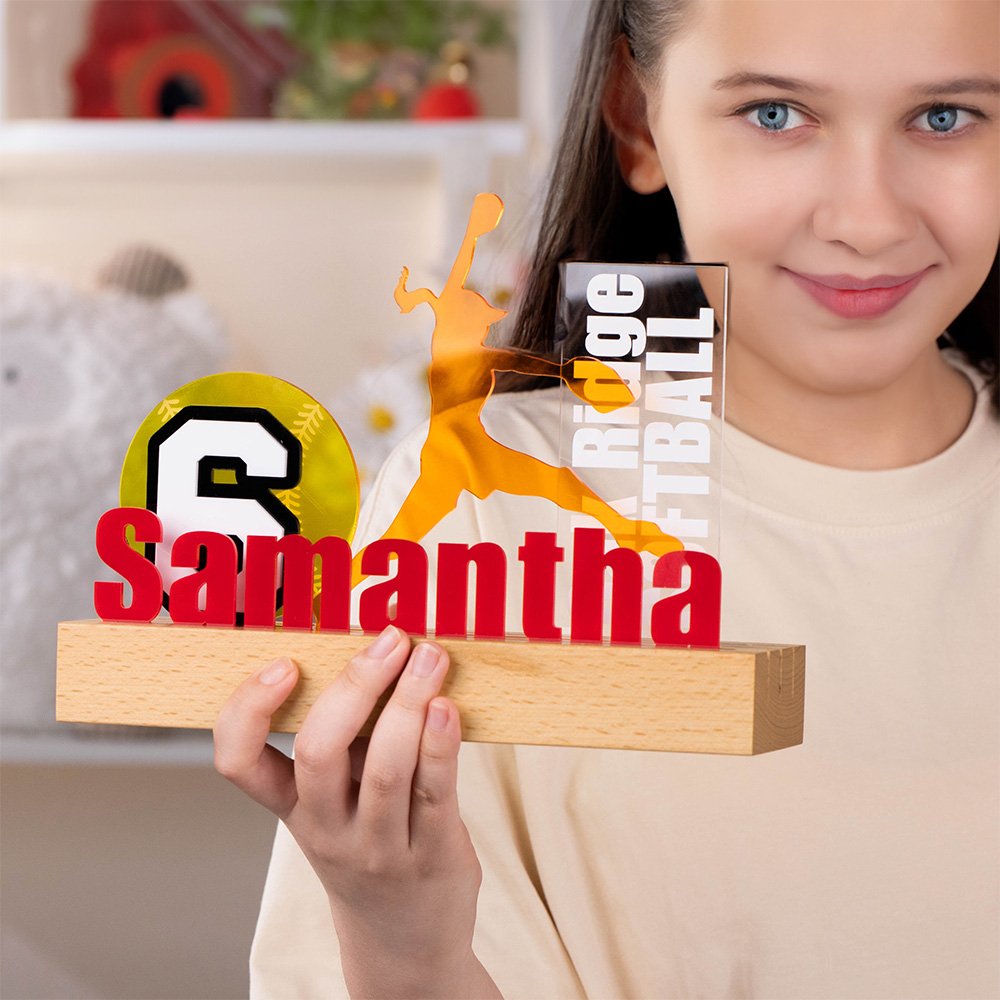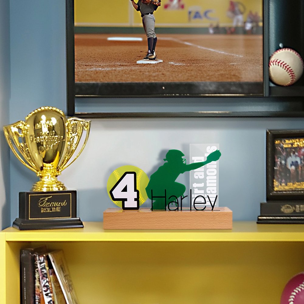 Täydellinen erilaisiin ympäristöihin, tämä kompakti mutta vaikuttava jalusta sopii makuuhuoneen yöpöydälle, toimiston työpöydälle tai olohuoneen hyllylle. Sen tyylikäs muotoilu sopii mihin tahansa sisustustyyliin, modernista perinteiseen. Olipa se esillä ylpeänä palkintokaapissa tai hienovaraisena osoituksena softball-innostuksesta, se tuo persoonallisen lisän mihin tahansa tilaan.