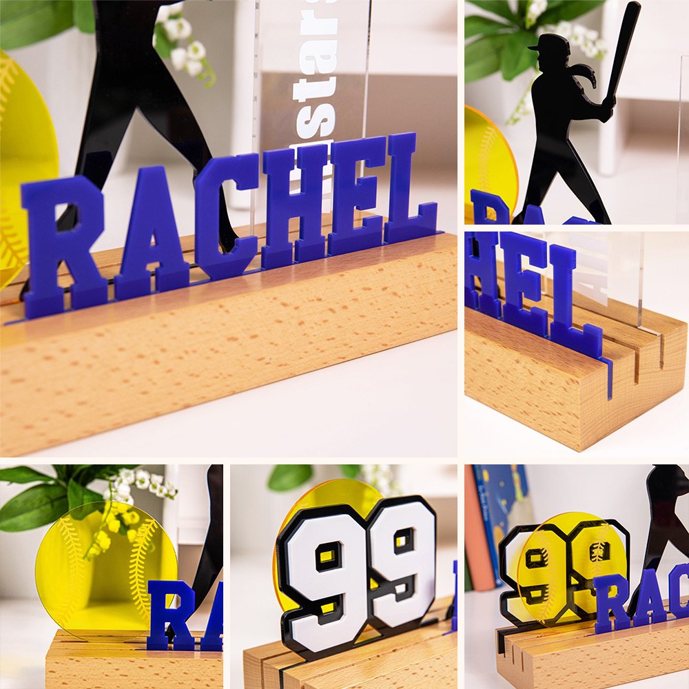 Tämä henkilökohtainen softball-pelaajan siluettilaatta on ainutlaatuinen kunnianosoitus, jossa yhdistyvät täydellisesti urheilullinen intohimo ja henkilökohtainen tunnustus. Mukautettavien numeroiden, nimien, tekstin ja siluettivärien ansiosta se on enemmän kuin pelkkä muistomerkki; se on softball-pelaajan saavutusten juhlaa. Kirkas akryylimuotoilu tuo pelaajan siluetin esiin upealla selkeydellä, kun taas kovapuinen pohja lisää klassista eleganssia, mikä tekee siitä näyttävän missä tahansa huoneessa.