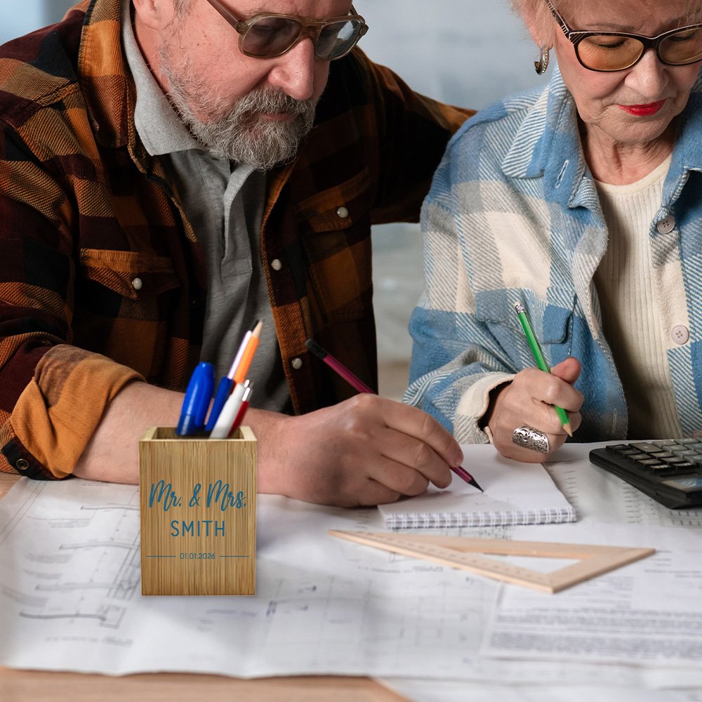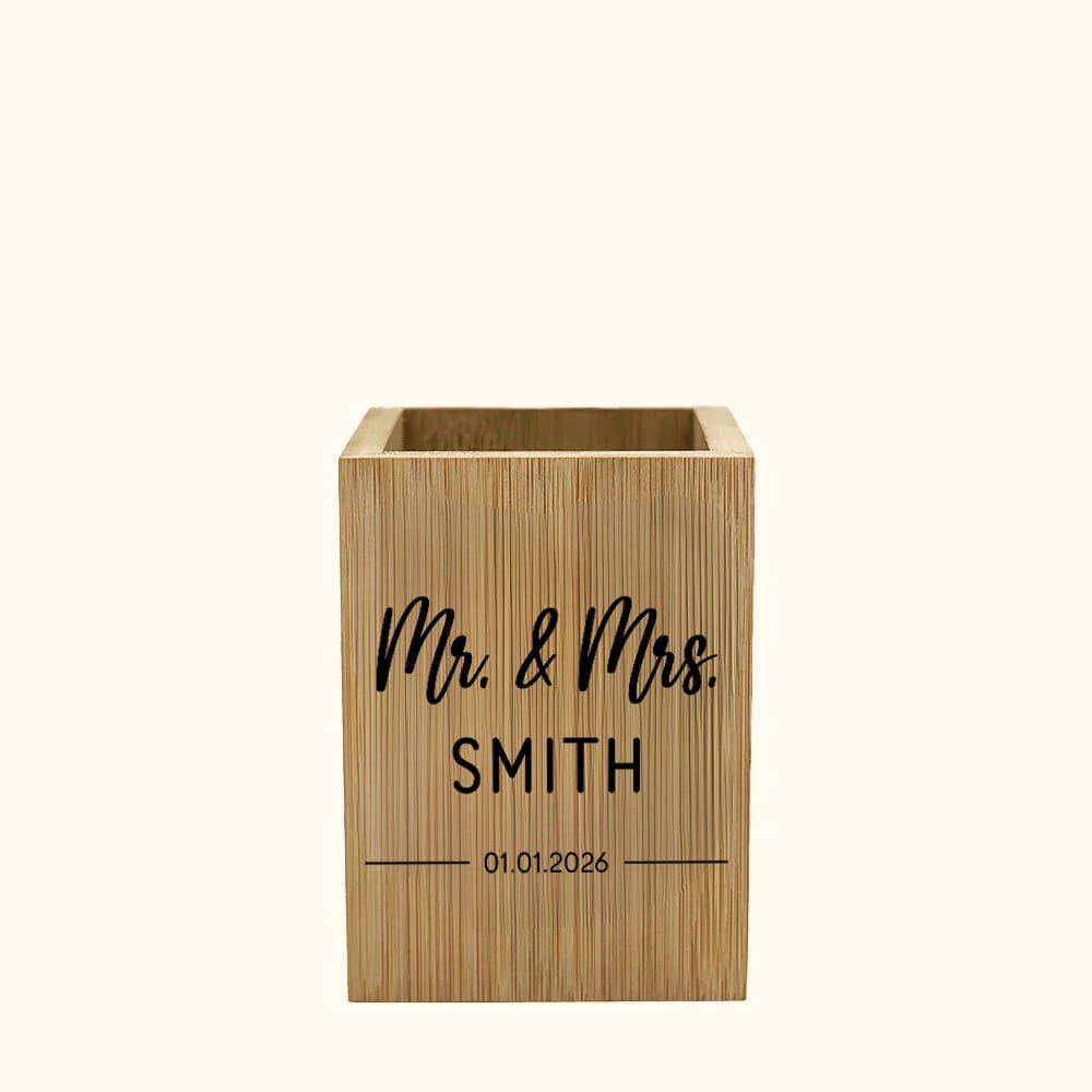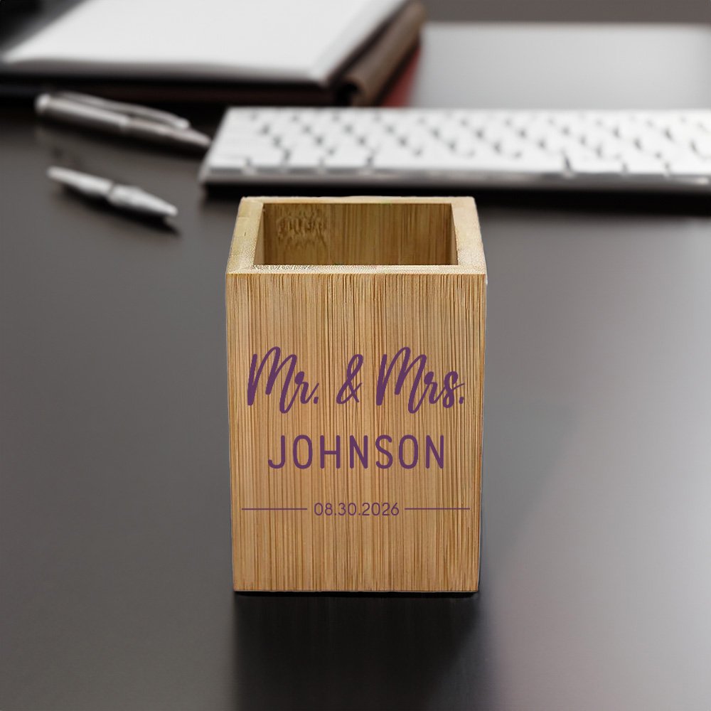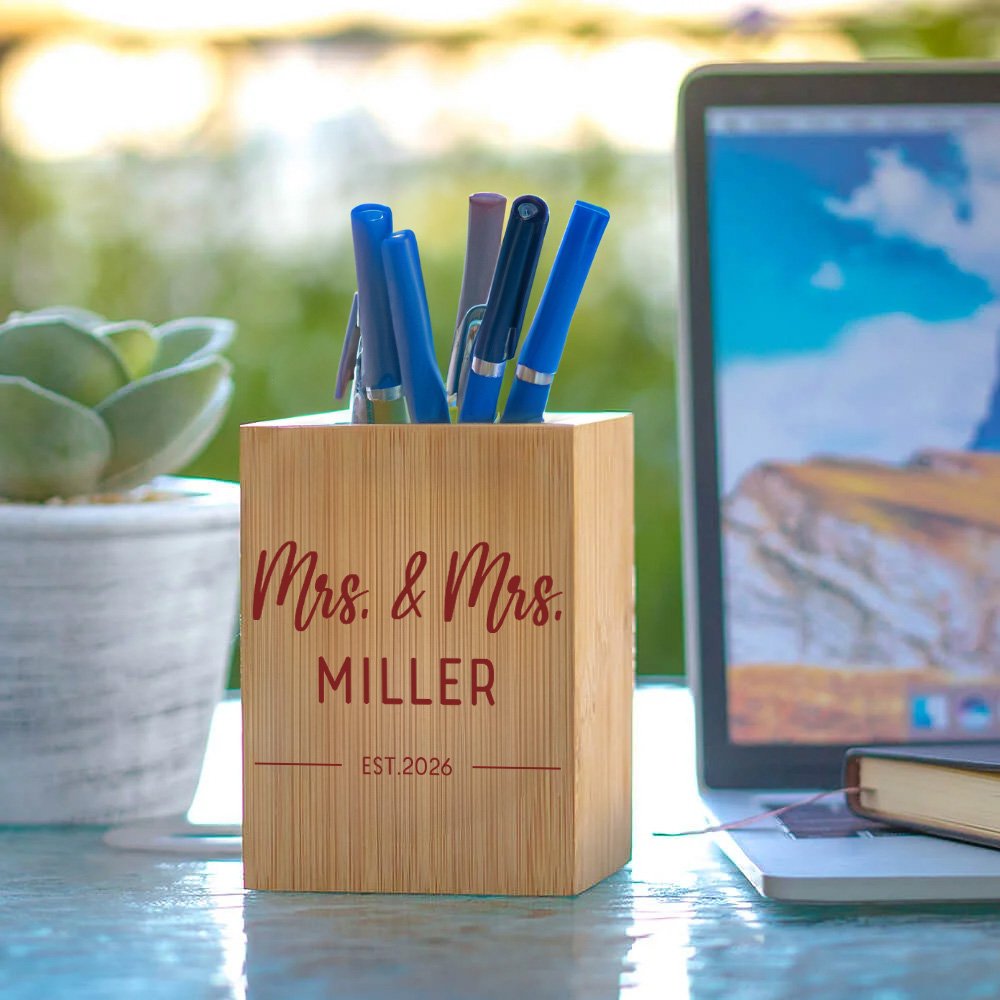 Tämä bambusta valmistettu kynäteline on tyylikäs ja toimiva, ja se tuo lämpöä mihin tahansa työtilaan. Se on suunniteltu huolellisesti säilyttämään kynät, lyijykynät ja pienet toimistotarvikkeet siististi, mikä auttaa pitämään työpöytäsi järjestyksessä ja sotkuisena. Voit mukauttaa sen nimellä ja päivämäärällä, jotta siitä tulee ainutlaatuinen työpöydän lisävaruste. Tämä ominaisuus tekee siitä ikimuistoisen lahjan.