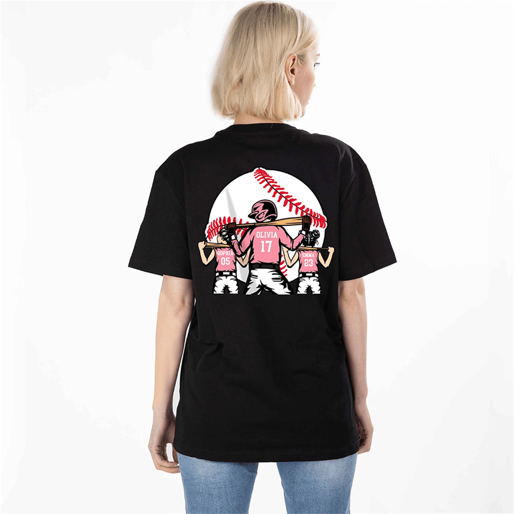 Tämä baseball-äiti-aiheinen T-paita on täysin muokattavissa 1-3 sarjakuvakuvalla lapsistasi sekä heidän nimillään ja pelipaidan numeroilla. Etupuolella on minimalistinen mutta huomiota herättävä "Baseball MOM" -teksti yhdistettynä sydämen muotoiseen baseball-kuvioon. Takapuolella on vilkas kohtaus, jossa lapsesi pitelee mailaa baseball-taustaa vasten. Se on omaleimainen ja sydäntä lämmittävä tyyli, joka erottuu kentän laidalla ja juhlistaa ainutlaatuista identiteettiäsi urheiluäitinä.