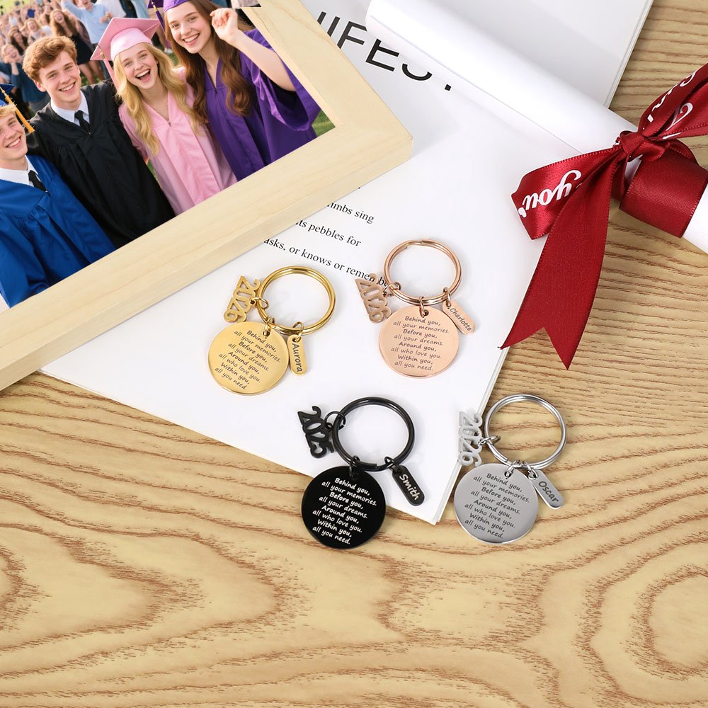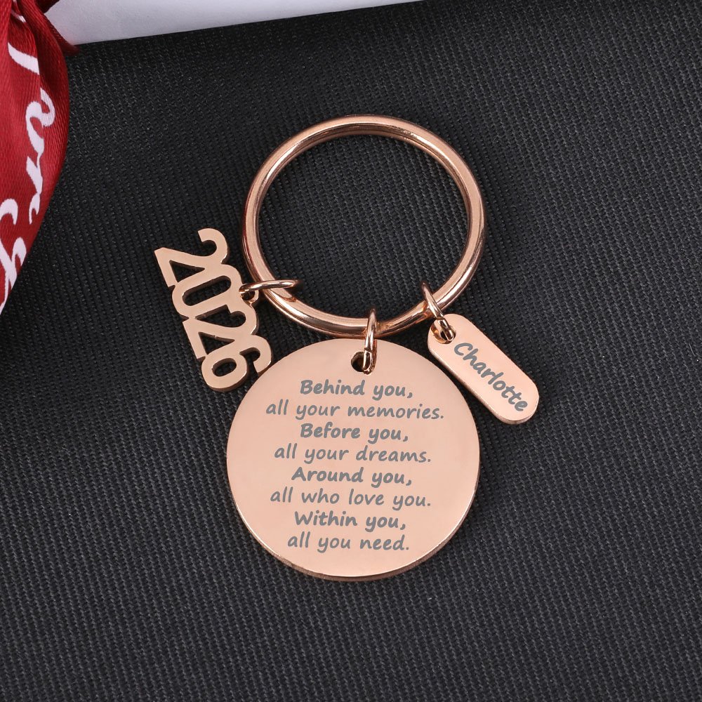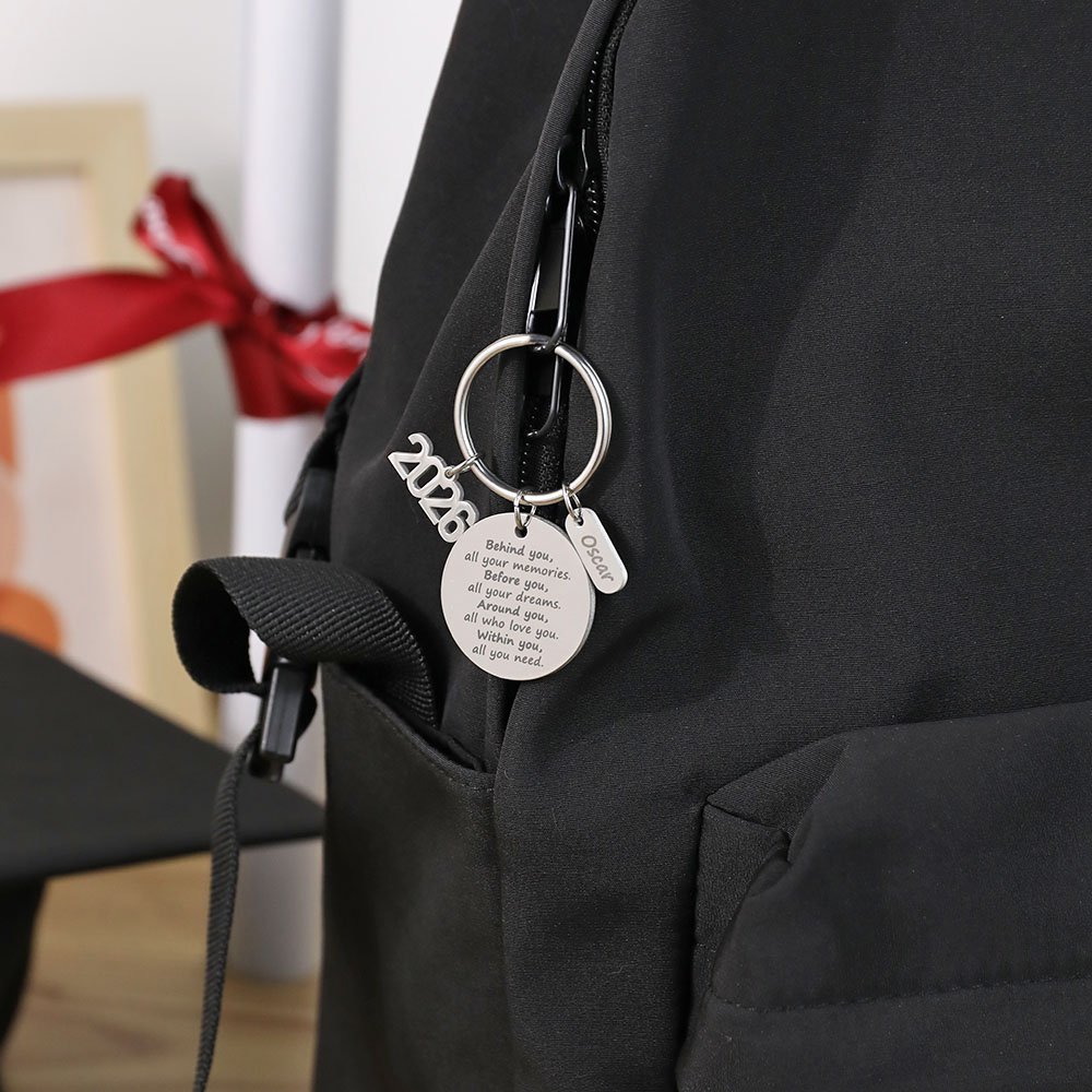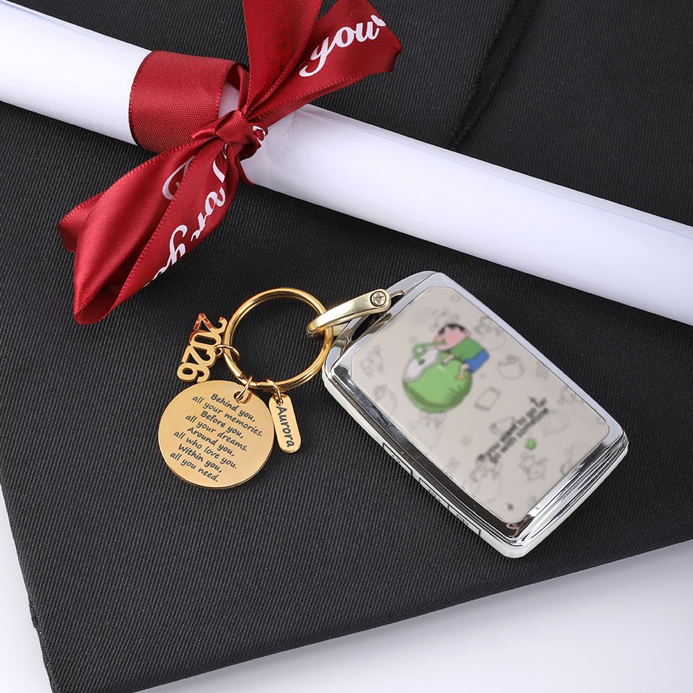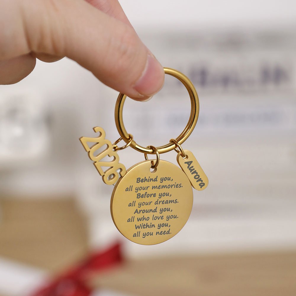 Tässä tyylikkäässä avaimenperässä on koskettava kirjoitus: "Takanasi kaikki muistosi. Edessäsi kaikki unelmasi. Ympärilläsi kaikki, jotka rakastavat sinua. Sisälläsi on kaikki, mitä tarvitset." Se muistuttaa valmistuneita heidän arvokkaasta matkastaan. Voit myös lisätä valmistuneen nimen ja valmistumisvuoden ja luoda ainutlaatuisen muistoesineen, joka kunnioittaa hänen kovaa työtään ja henkeään.