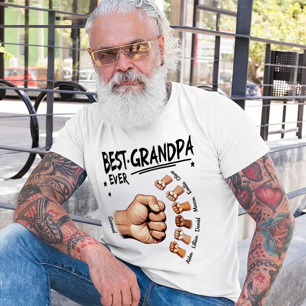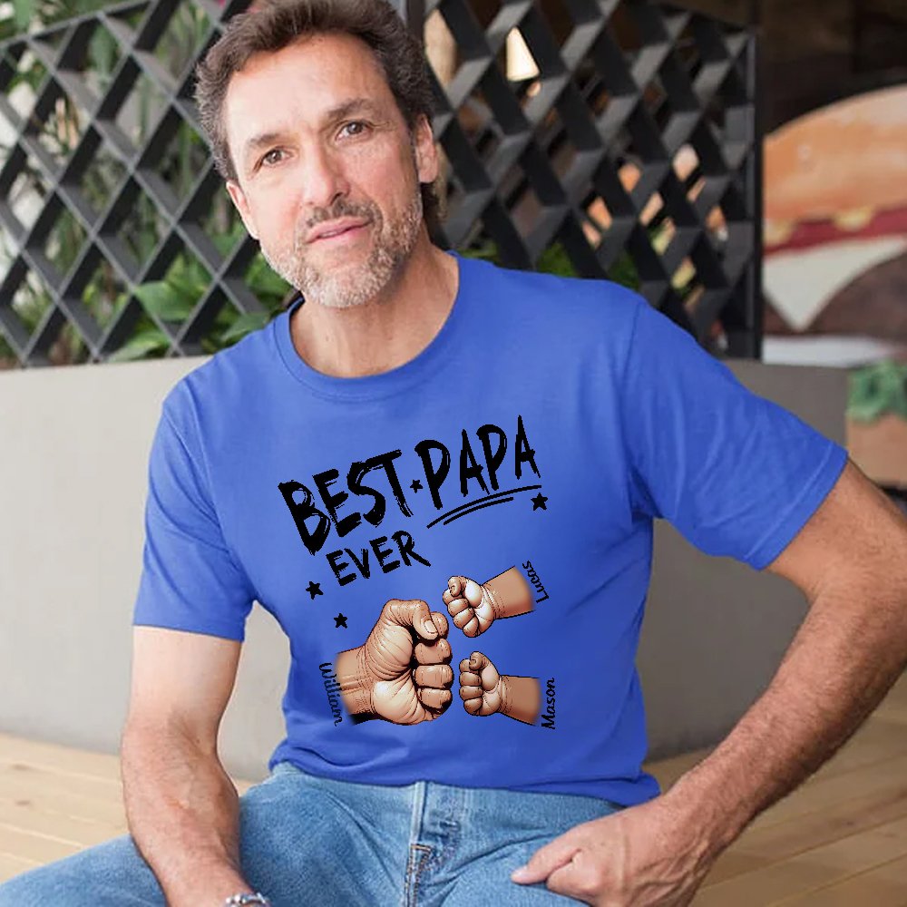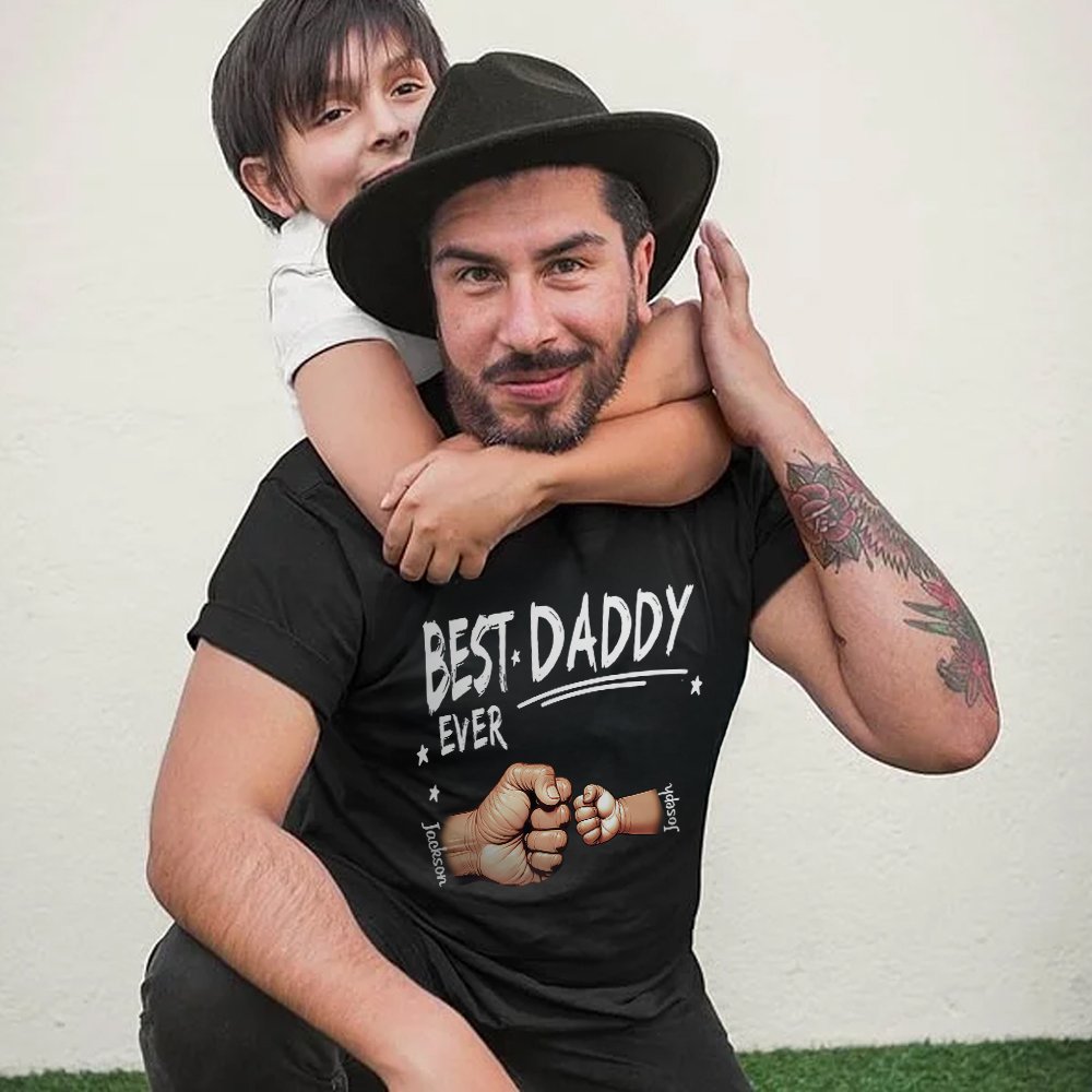 Tässä t-paidassa on isän ja lasten välinen nyrkiniskumalli. Se voidaan räätälöidä 1-12 lapsen nyrkeillä ja nimillä. Sanat "Best Dad Ever" osoittavat syvää kiintymystä isän ja lasten välillä. Tämän asun käyttäminen ilmaisee lasten ja isän välistä rakkautta.