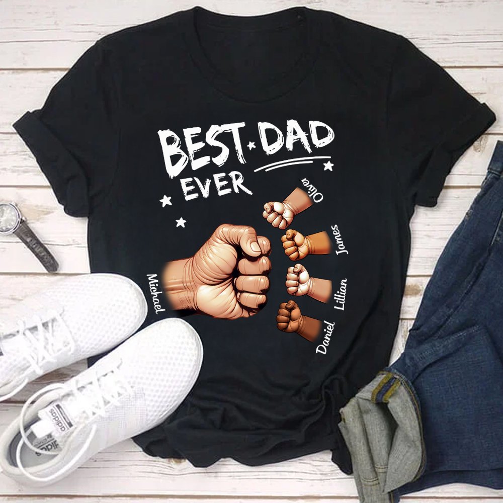 Tässä t-paidassa on isän ja lasten välinen nyrkiniskumalli. Se voidaan räätälöidä 1-12 lapsen nyrkeillä ja nimillä. Sanat "Best Dad Ever" osoittavat syvää kiintymystä isän ja lasten välillä. Tämän asun käyttäminen ilmaisee lasten ja isän välistä rakkautta.