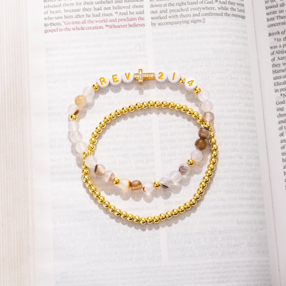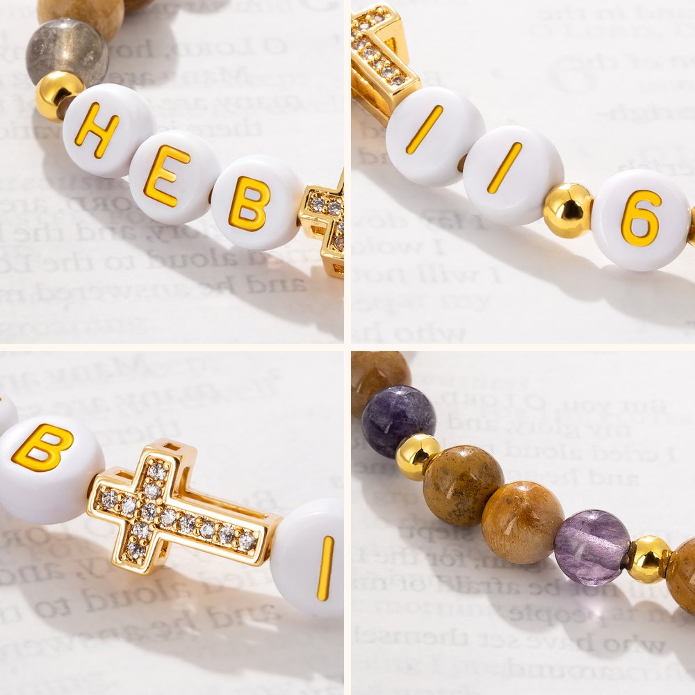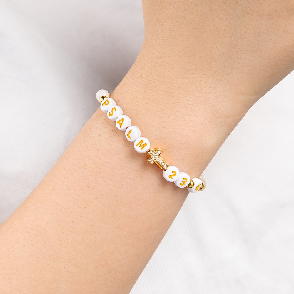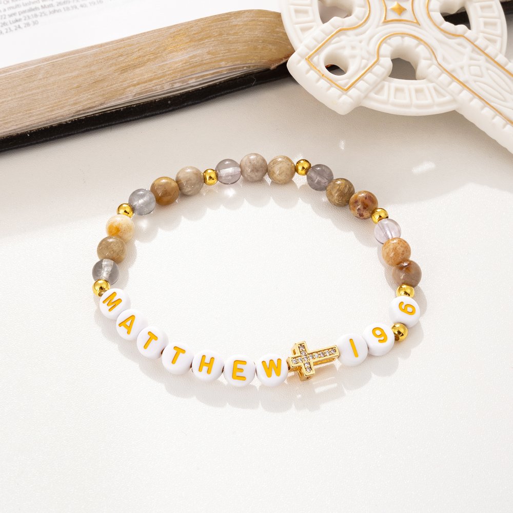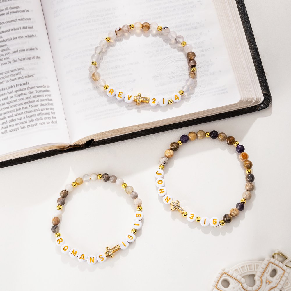 Tässä rannekorussa on kauniisti muotoiltu muotoilu, jossa on risti riipus kuoret zirkoni sen keskeinen koristeellinen elementti, korostaen sen uskonnollista teemaa. Rannekorun helmet ja kirjaimet voidaan personoida, jolloin voit valita Raamatun jakeita, nimiä tai muita merkityksellisiä sanoja, mikä tekee jokaisesta rannekorusta ainutlaatuisen taideteoksen.