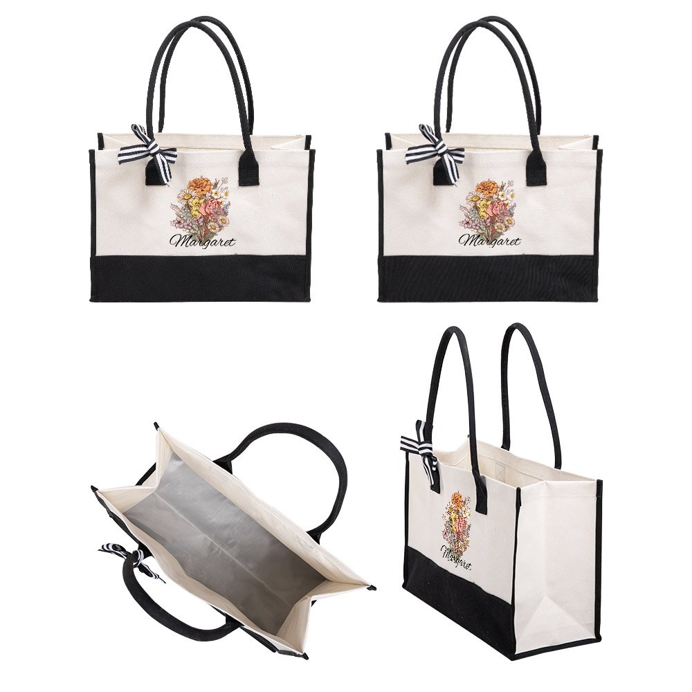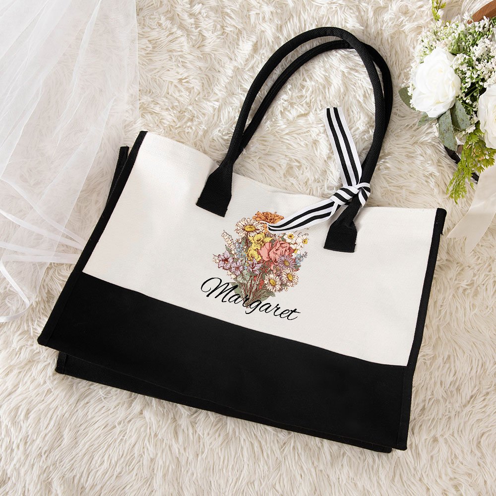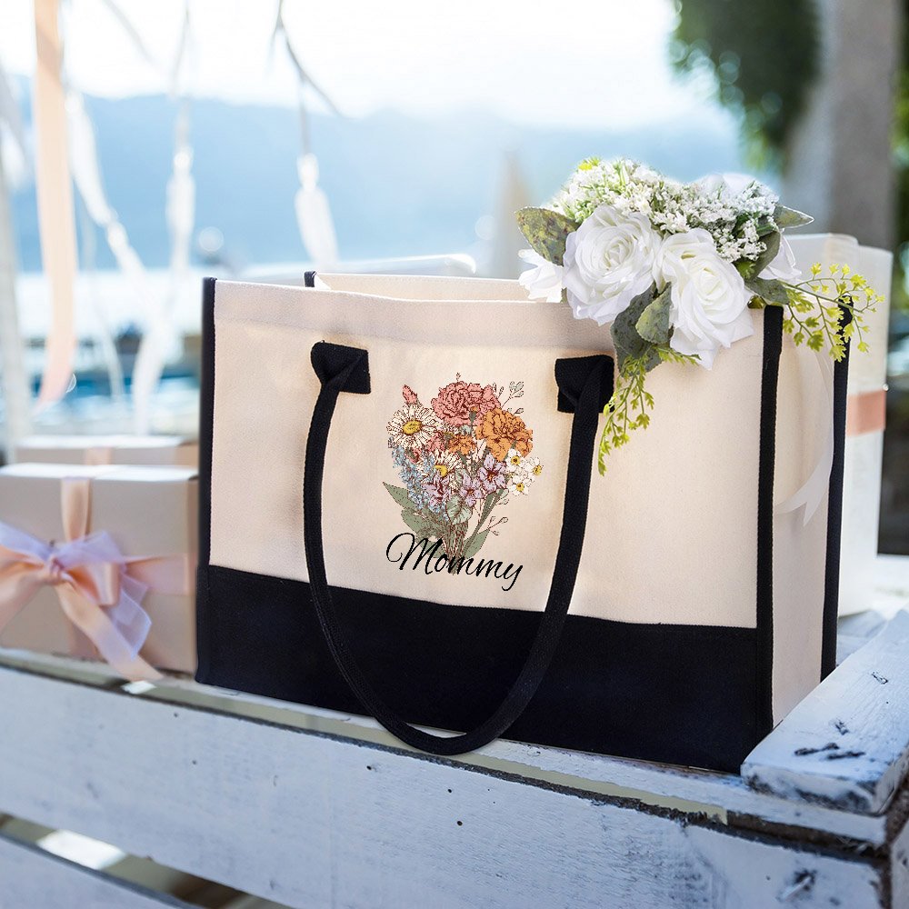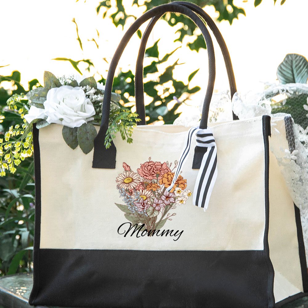 Tämä laukku on upea kuvio syntymän kukkakimppu, jokainen kukka edustaa lapsen syntymäkuukausi ja alla voidaan räätälöidä äidin tai isoäidin nimi, luoda ainutlaatuinen ja mielekäs ranta laukku ja ilmaisee rakkautta ja ihailua heille.