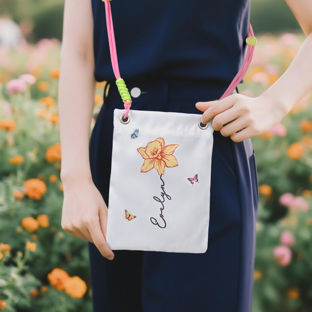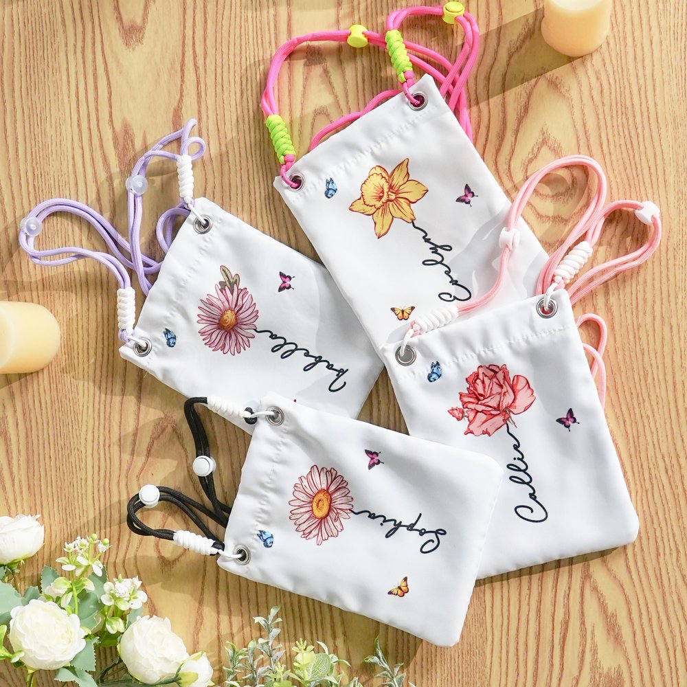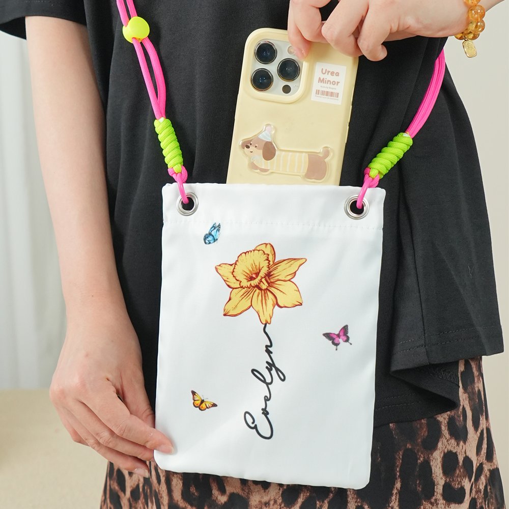 Tässä ristikkäisessä puhelinkassissa yhdistyvät tyyli ja persoonallisuus. Puhtaanvalkoisella pohjalla on eloisat syntymäkukkakuviot ja värikkäitä perhosia. Voit myös muokata nimiä kukkien alle, jolloin jokainen laukku on ainutlaatuinen.
