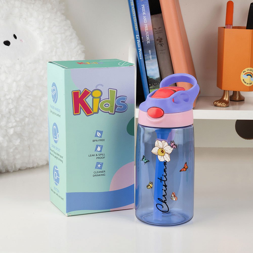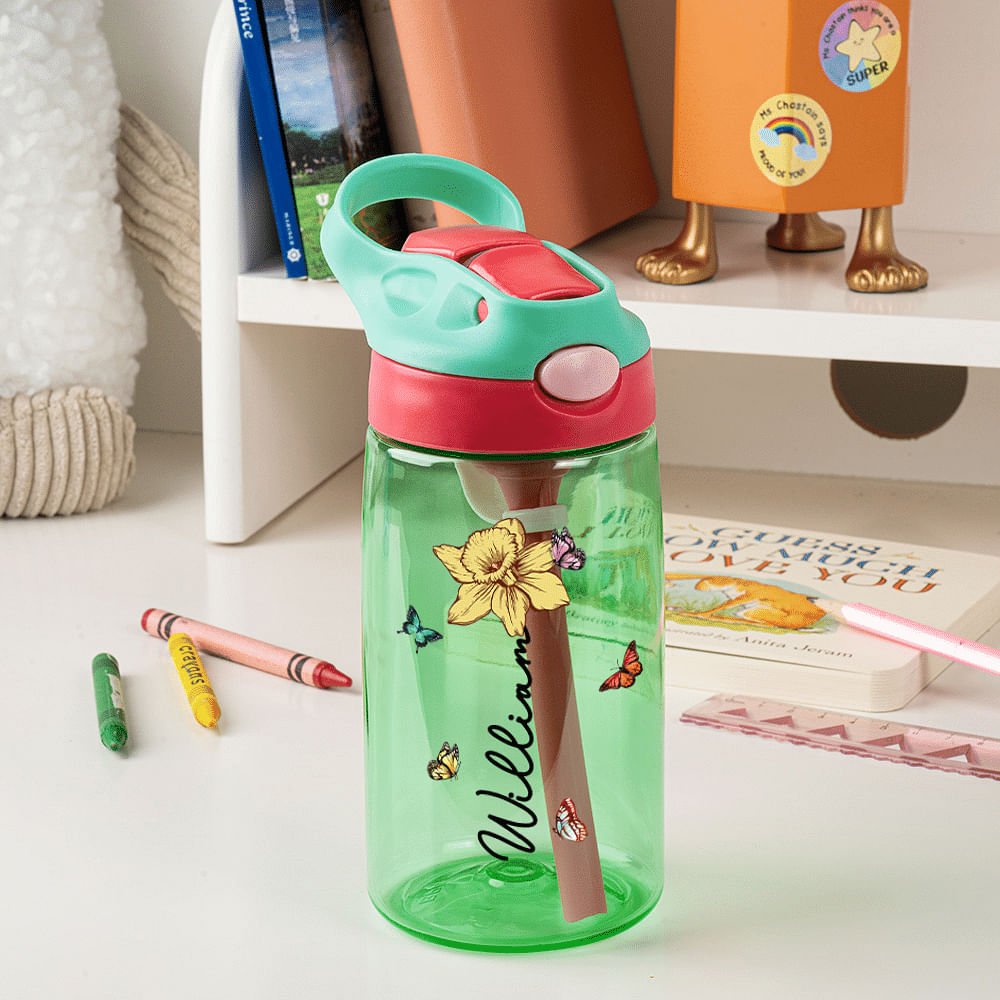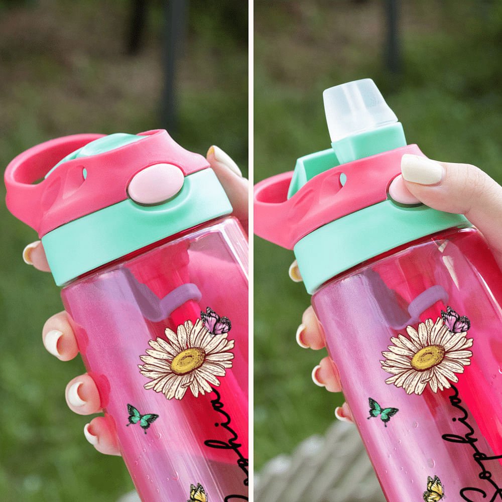 Tämä vesipullo on koristeltu vintage-henkisillä syntymäkukilla ja perhoskuvioilla, jotka lisäävät visuaalista vetovoimaa ja tekevät siitä entistäkin söpömpi ja hauskempi. Voit myös mukauttaa pullon nimen, jotta siitä tulisi ainutlaatuisempi. Vesipulloja on saatavana useissa eri väreissä eri lasten mieltymysten mukaan.
