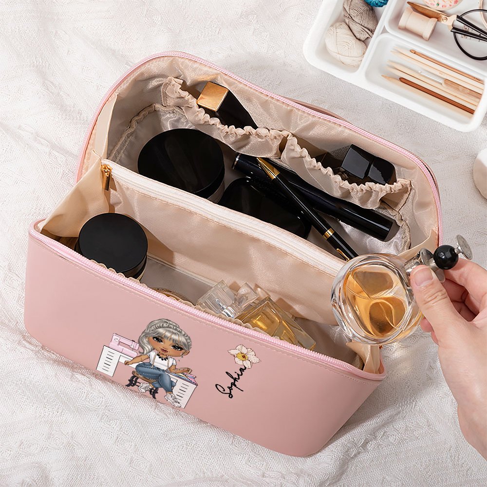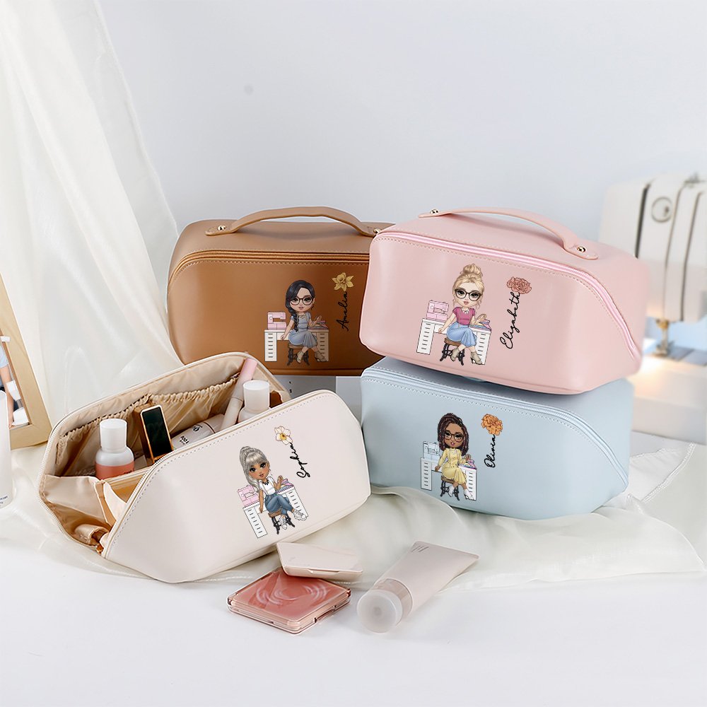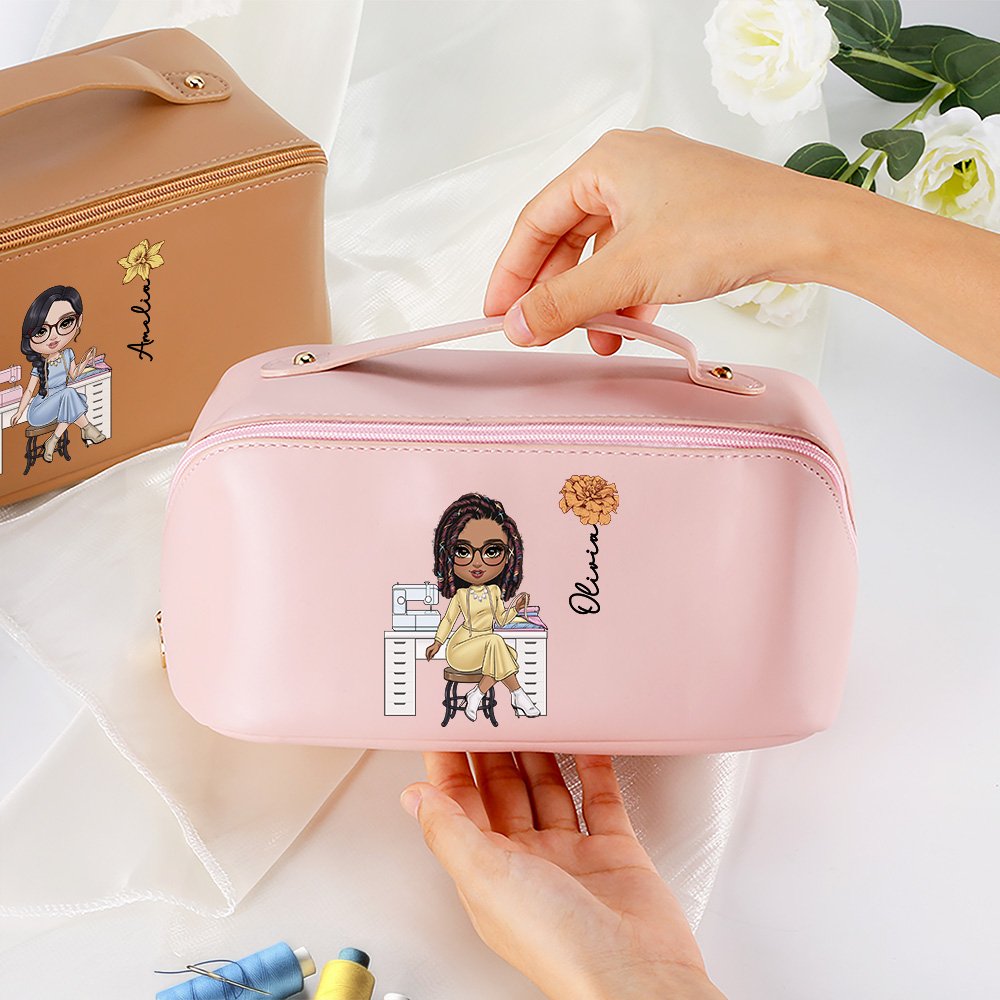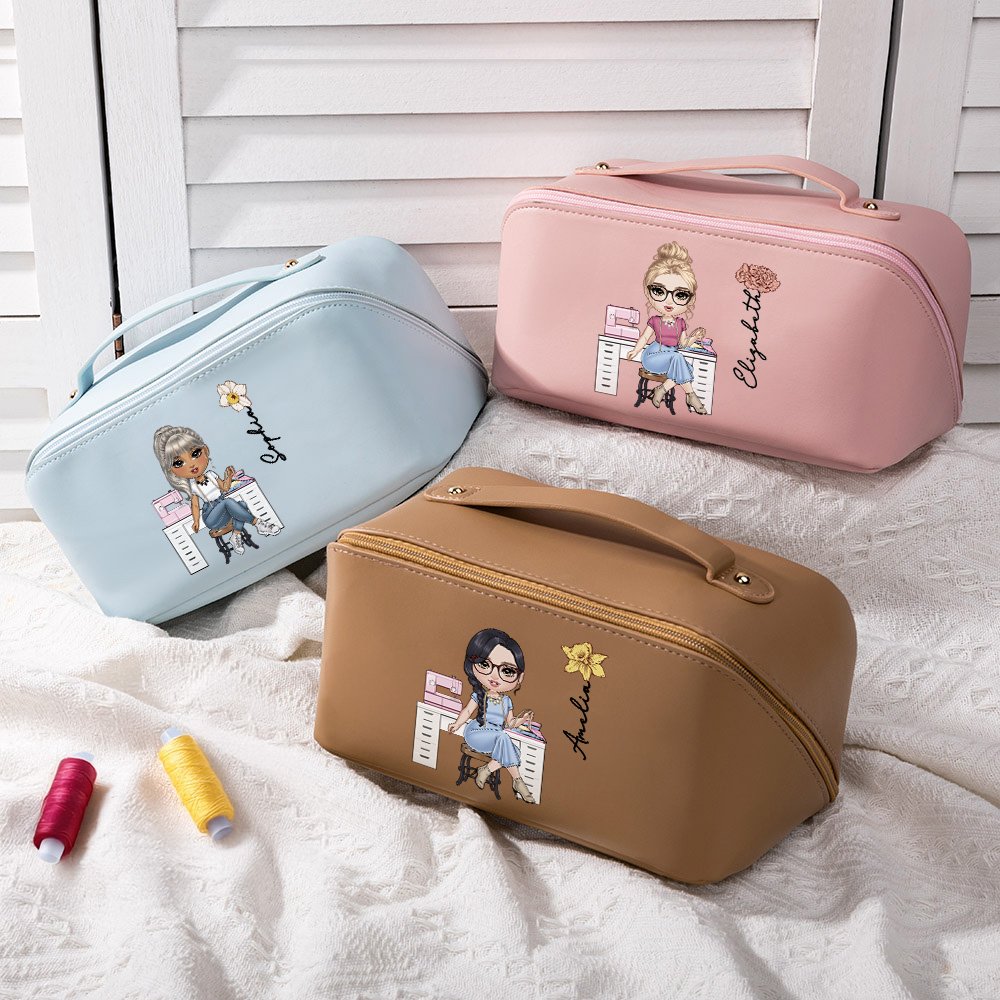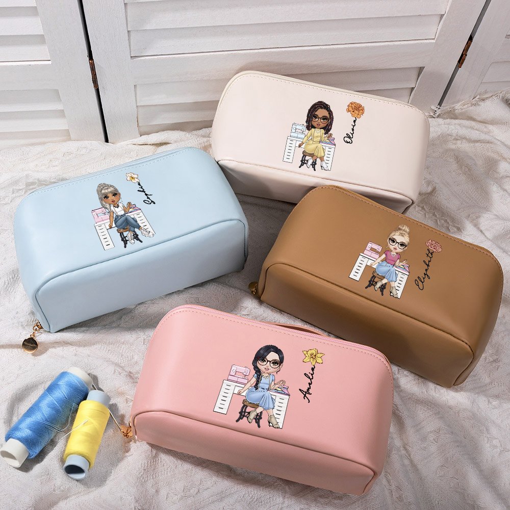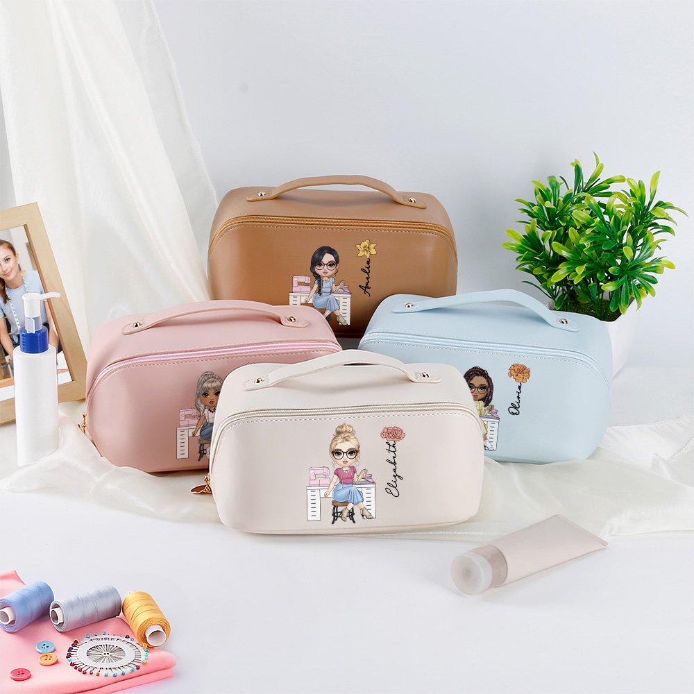 Tässä kosmeettisessa laukussa on kaunis syntymäkukka ja söpö sarjakuvamaisen ompeluhahmon muotoilu, joka perustuu kuvaan, mikä lisää leikkisää ja tyylikästä tunnelmaa. Lisäksi voit mukauttaa sen omalla nimelläsi, jotta tämä laatikko olisi ainutlaatuisempi.