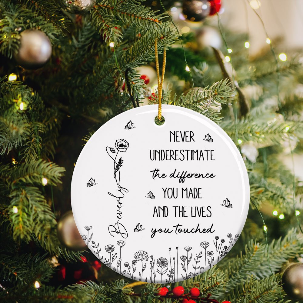 Jokaisessa keraamisessa koristeessa on räätälöity syntymäkukka, joka edustaa kunkin kuukauden kukkia, sekä teksti "Never underestimate the difference you made and the lives you touched.". Tämä muotoilu välittää ainutlaatuisen tunneviestin ja merkityksen. Voit lisätä minkä tahansa haluamasi nimen, jolloin syntyy uniikki koriste-esine.