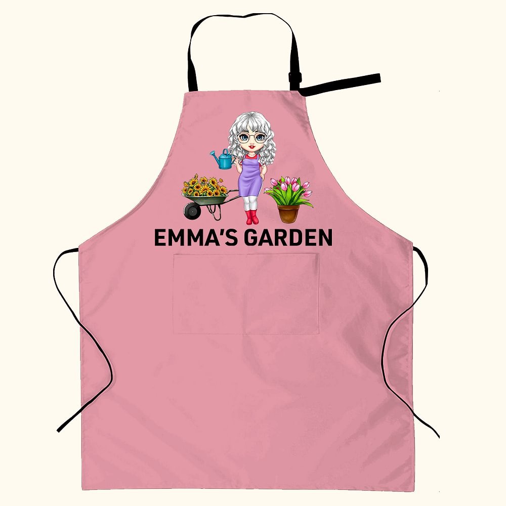 Tämä viehättävä esiliina on suunniteltu puutarhan ystäville, ja siinä on muokattavissa oleva ihastuttava sarjakuvahahmo, jolla on puutarhatyökalu kukkivien kukkien ja ruukkujen ympäröimänä. Voit myös lisätä esiliinaan henkilökohtaisen tekstin, jotta siitä tulisi todella ainutlaatuinen.
