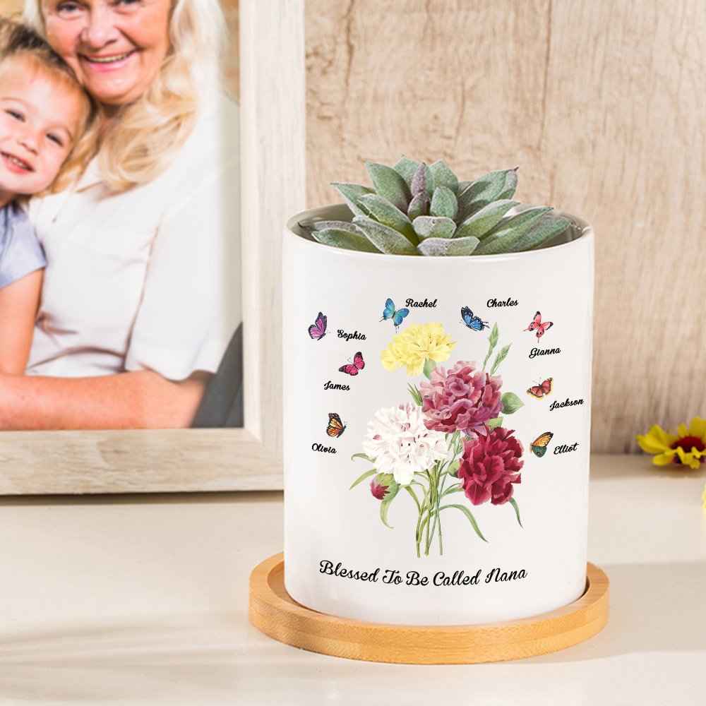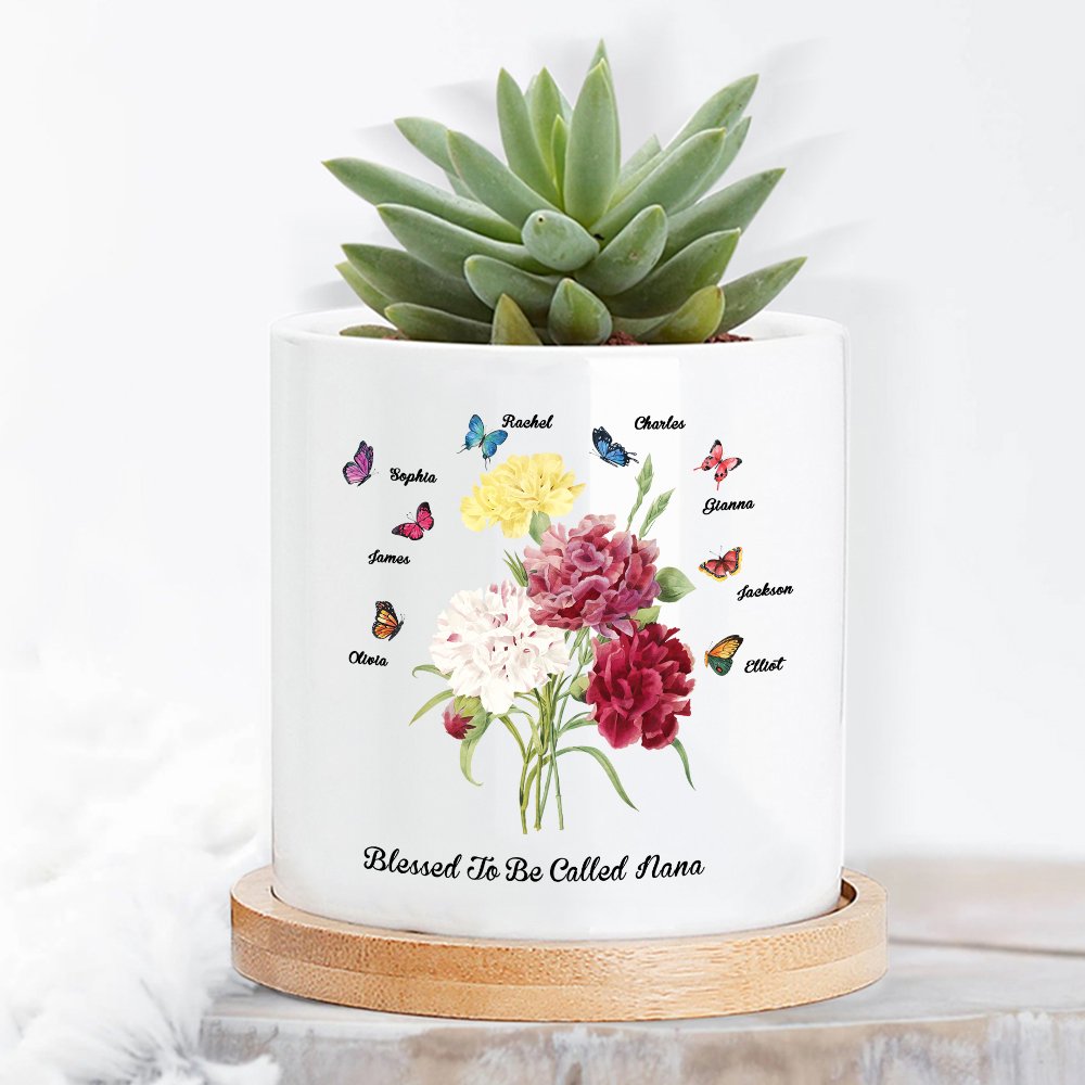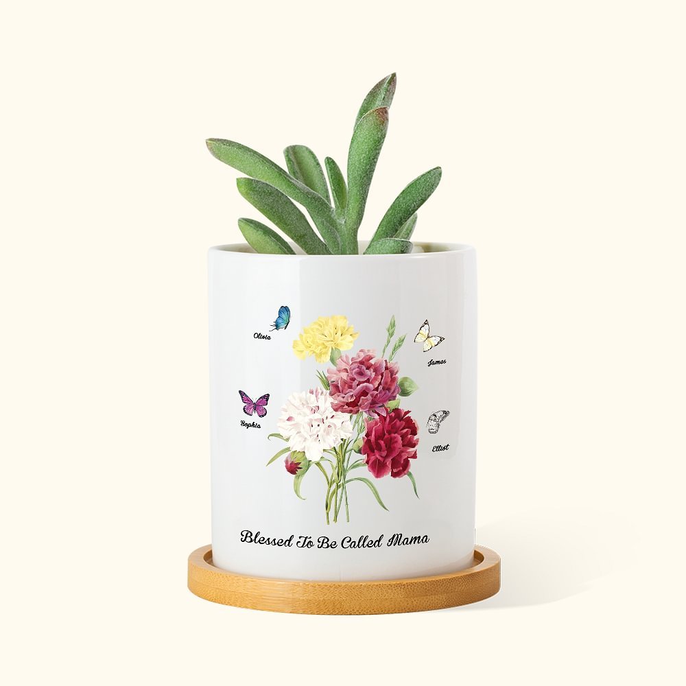Tämä äitienpäiväksi ihanteellinen keraaminen kasviastia on koristeltu kukkakimpulla neilikoita, joita ympäröivät perhoset merkiksi hyvyydestä. Voit valita perhosten määrän ja lisätä nimen sekä vastaanottajan nimityksen, ja kasviruukun pohjassa on huomaavainen lause "Blessed to be called", joka lisää tunnetta.