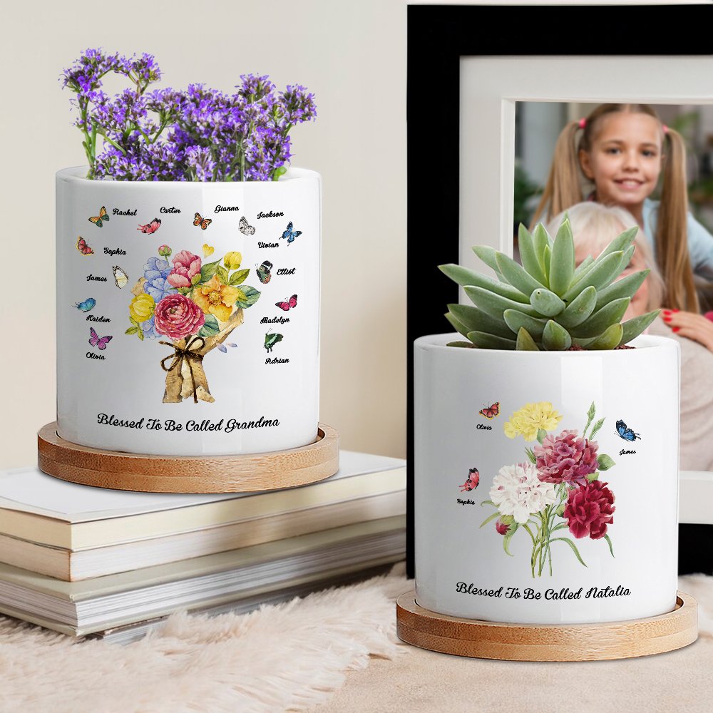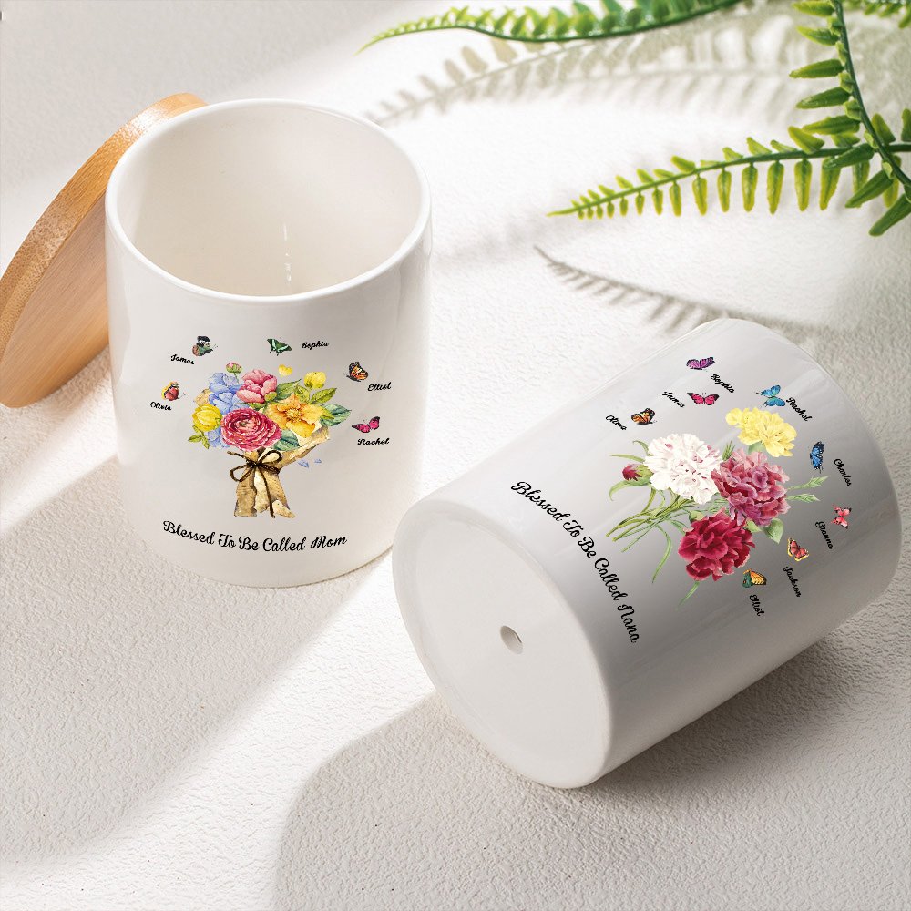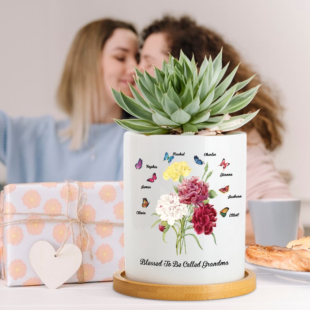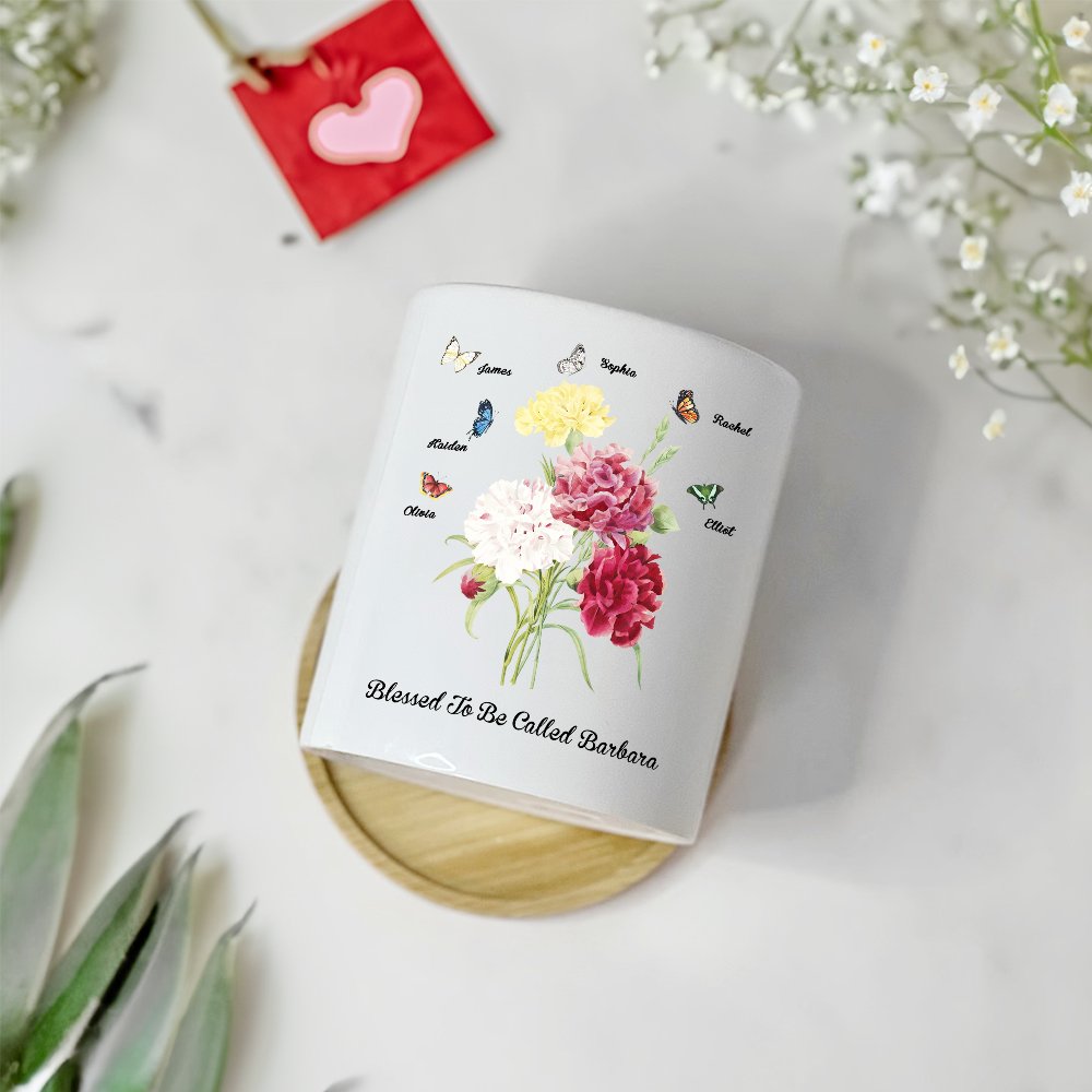 Tämä äitienpäiväksi ihanteellinen keraaminen kasviastia on koristeltu kukkakimpulla neilikoita, joita ympäröivät perhoset merkiksi hyvyydestä. Voit valita perhosten määrän ja lisätä nimen sekä vastaanottajan nimityksen, ja kasviruukun pohjassa on huomaavainen lause "Blessed to be called", joka lisää tunnetta.