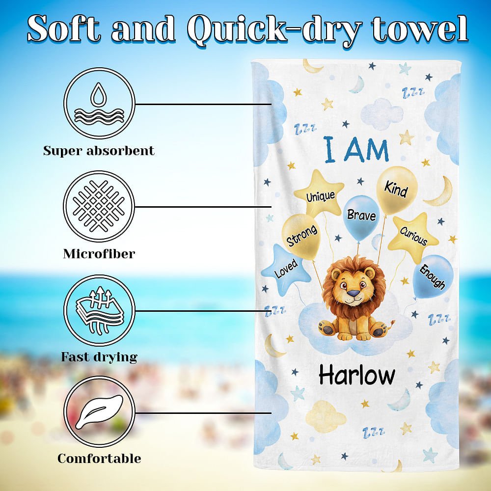 This beach towel features cute watercolor-inspired animal prints paired with balloons, stars, and the moon to create a dreamy and homey atmosphere. The text on the beach towel conveys positive self-affirming messages such as unique, kind, brave, strong, curious, loved, and good enough, which is a blessing and affirmation for the child and helps to boost their confidence and self-esteem. There are 37 different animal patterns to enrich your choice. Customize it with your child's name to make it even more special.