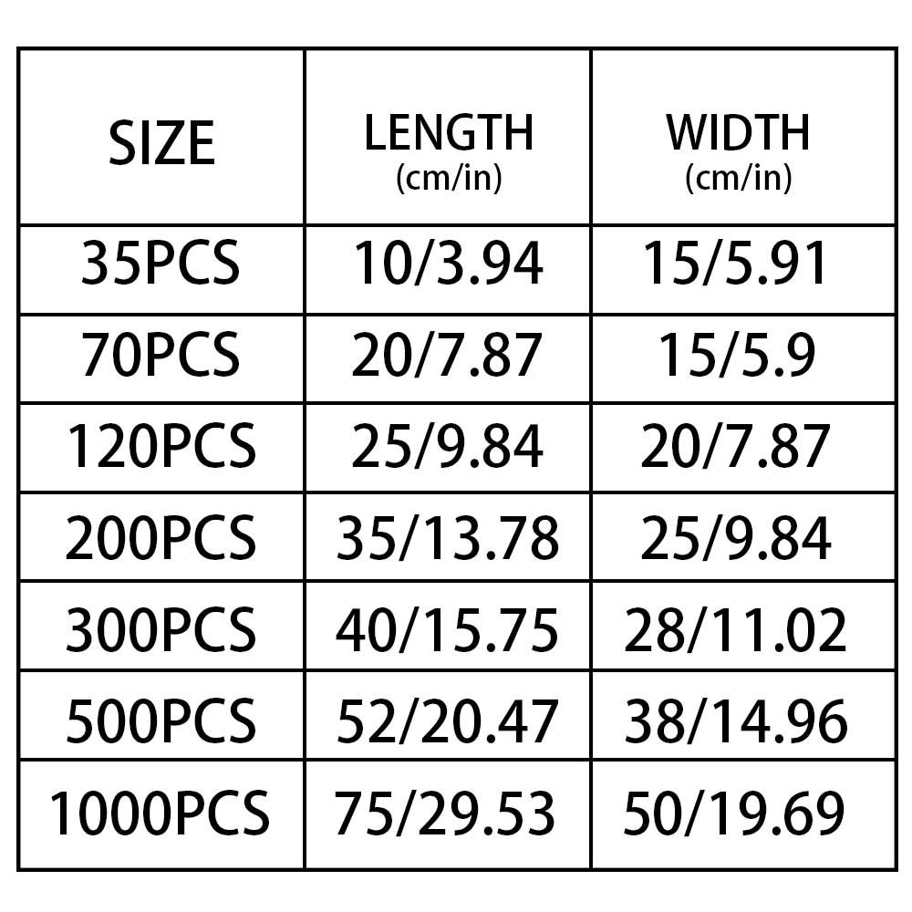 | Mittaus: | 35 kpl - 3.94" × 5.9"(10cm × 15cm), 70 kpl - 7.87" × 5.9"(20cm × 15cm), 120 kpl - 9.84" × 7.87"(25cm × 20cm), 200 kpl - 13.78" × 9.84"(35cm × 25cm), 300 kpl - 15.75" × 11.02"(40cm × 28cm), 500 kpl - 20.47" × 14.96"(52cm × 38cm), 1000 kpl - 29.53" × 19.69"(75cm × 50cm). |