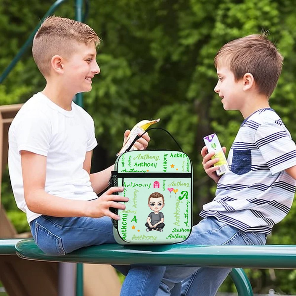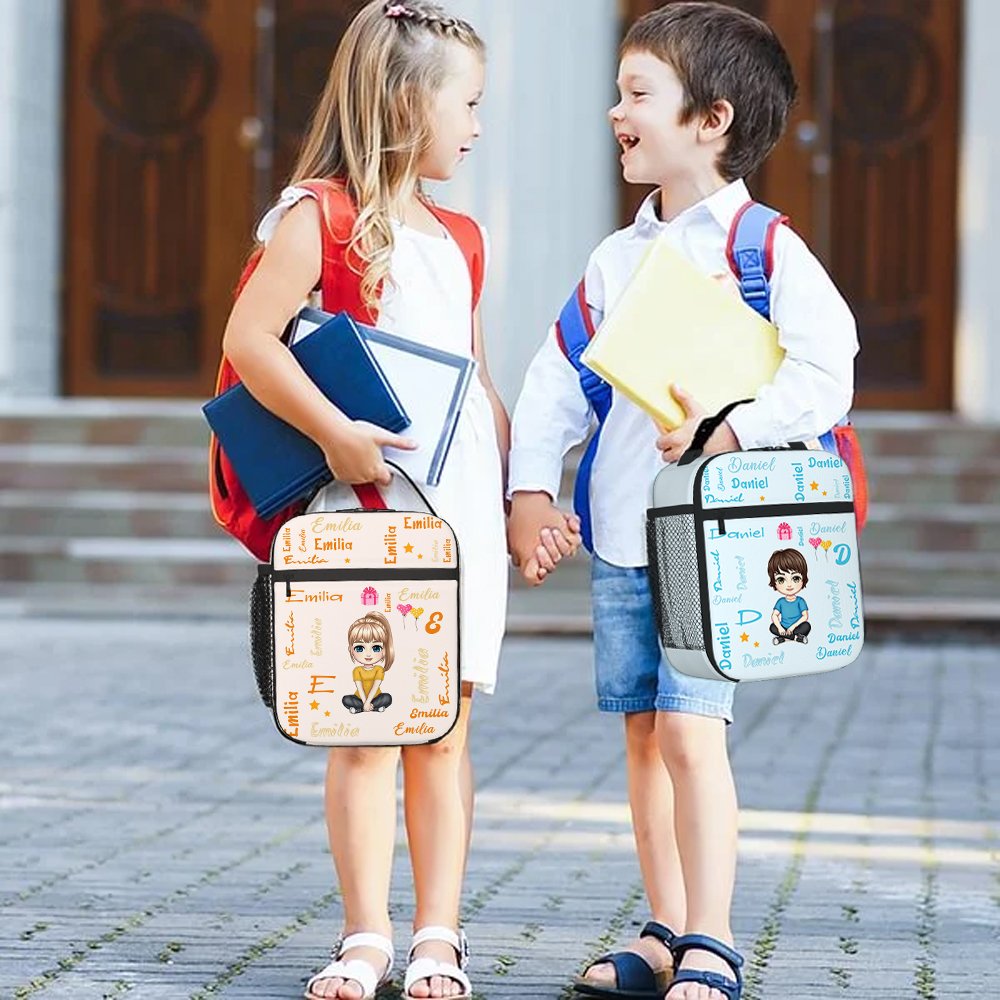 Tämä lounaslaukku on suunniteltu vilkkaalla sarjakuvahahmoaiheella ja räätälöity lapsen nimellä, ja siinä on kirkkaita värejä ja sarjakuvakuvia, jotka pulpahtavat ulos laukusta. Nimi esitetään useilla eri kirjasimilla, mikä päivittää tavallisen lounaslaatikon yllätyksiä täynnä olevaksi lounaskumppaniksi, jotta lapset avaavat lounaslaukun joka päivä täynnä odotusta.