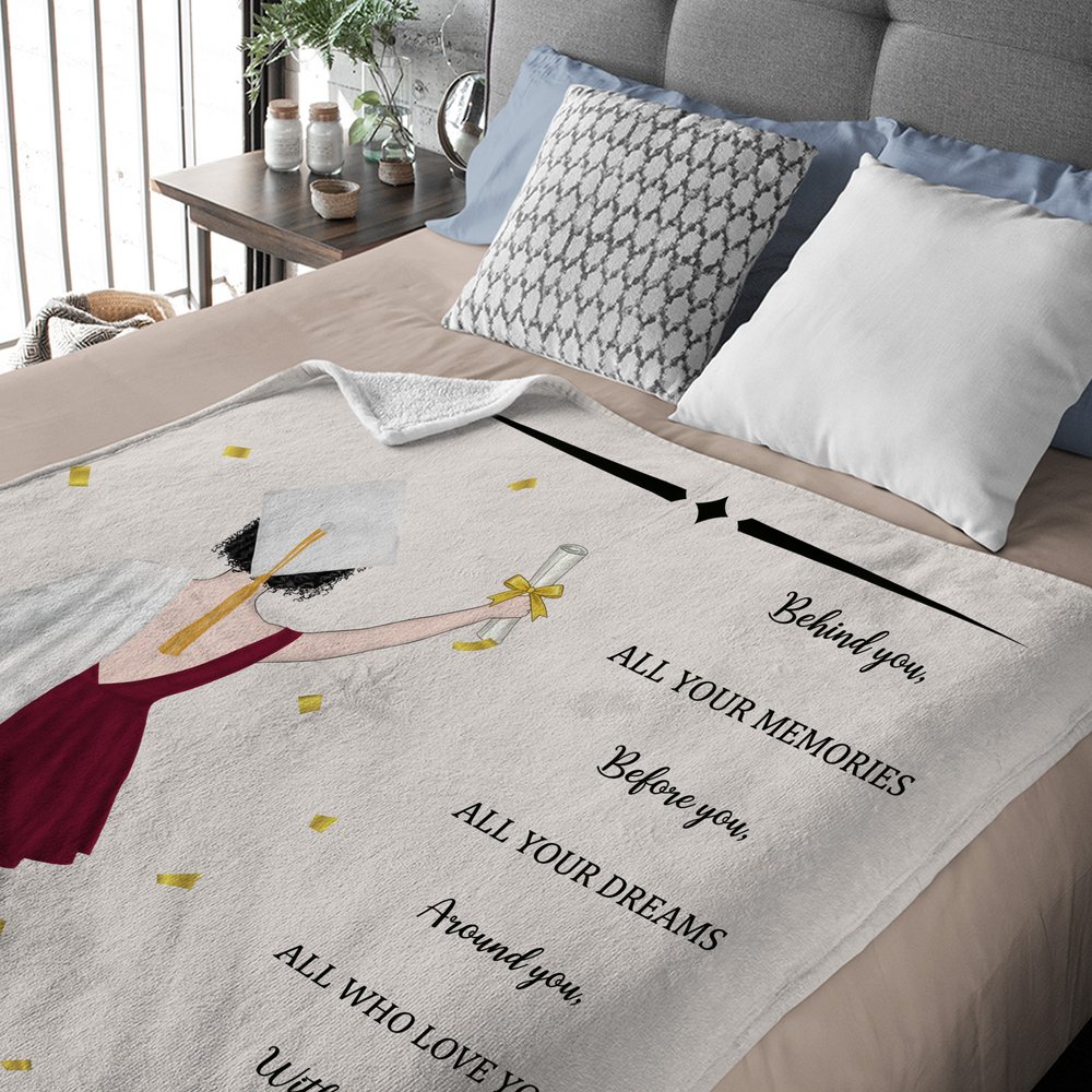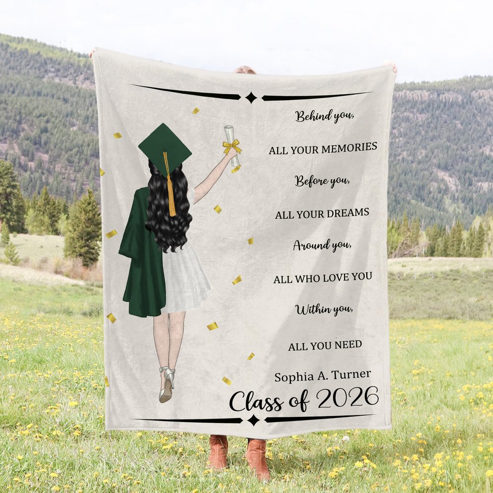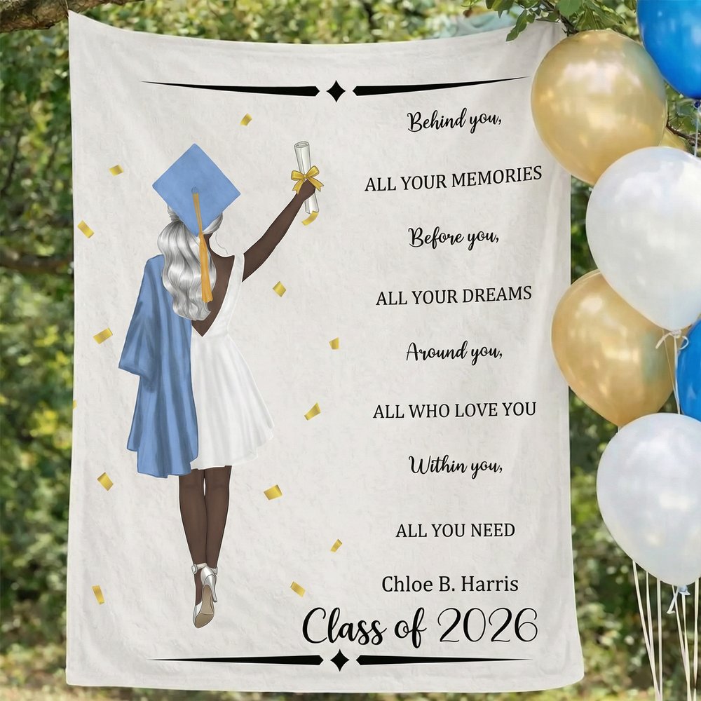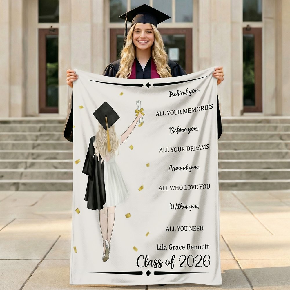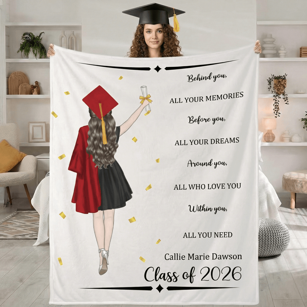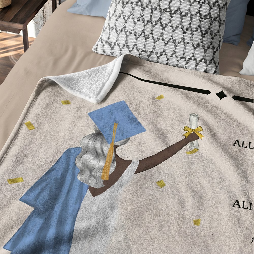 Tämä henkilökohtainen valmistumishuopa on huomaavainen ja merkityksellinen lahja kaikille valmistuneille. Se sopii täydellisesti valmistumisjuhliin, luokkakokouksiin tai onnittelulahjaksi perheeltä ja ystäviltä. Se on lahja, jossa yhdistyvät lämpö, mukavuus ja emotionaalinen merkitys, mikä tekee siitä pysyvän muiston tästä tärkeästä elämänhetkestä.