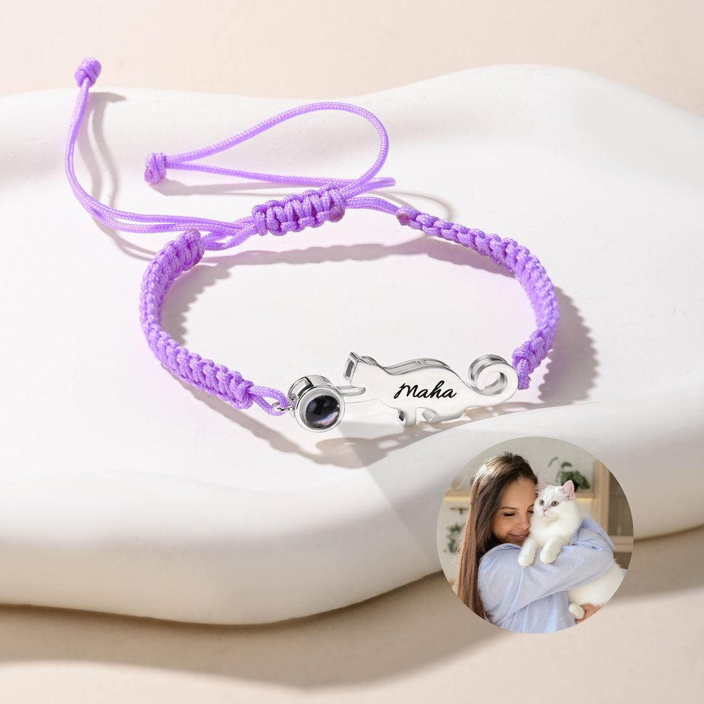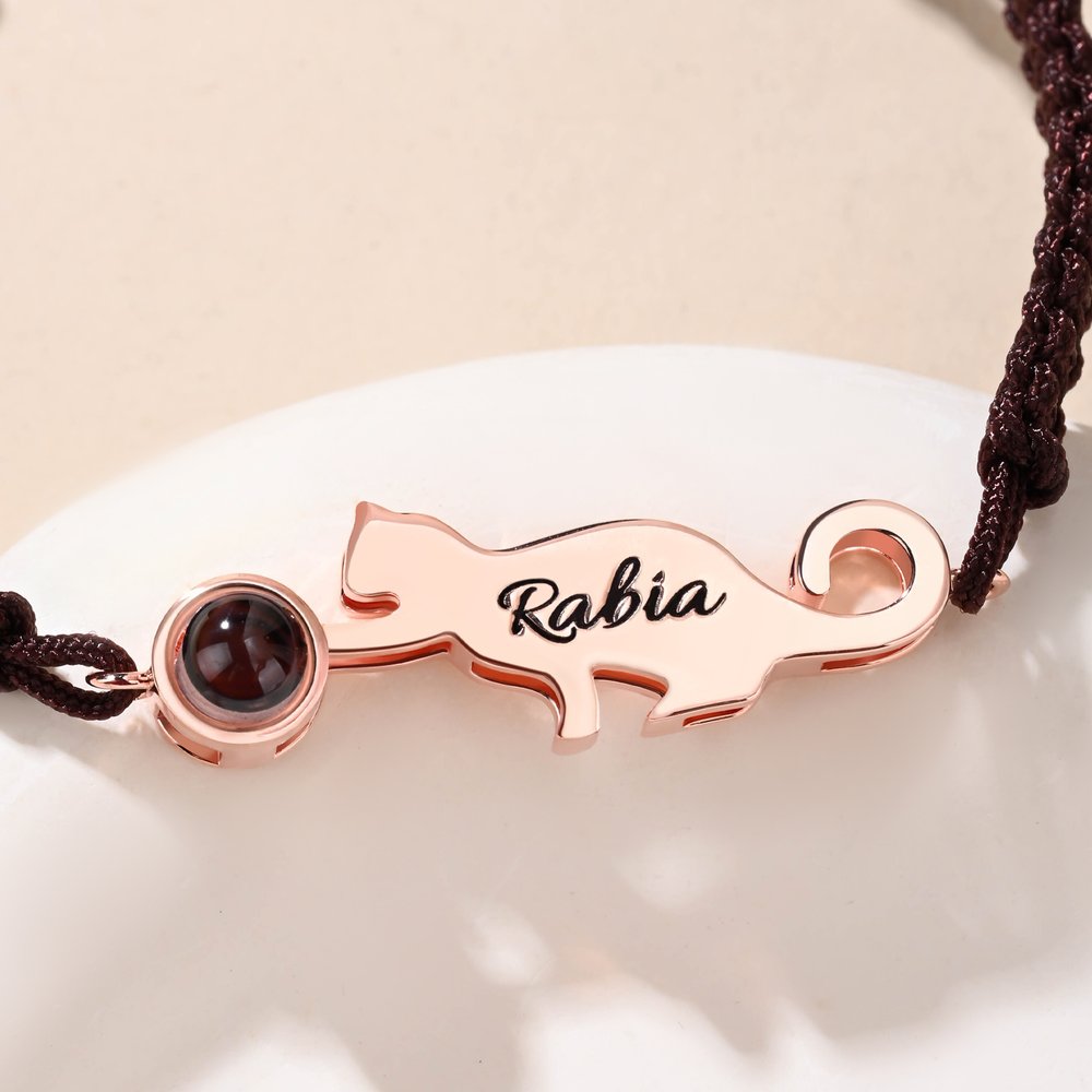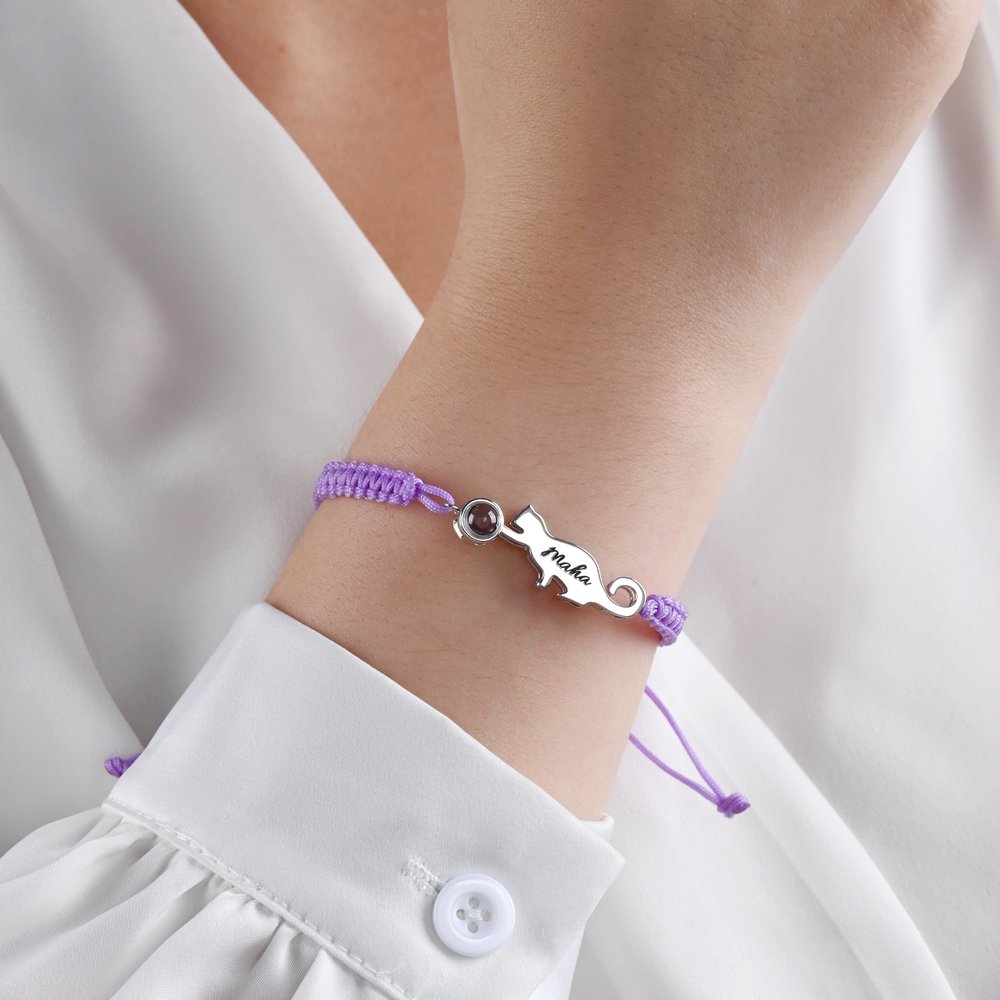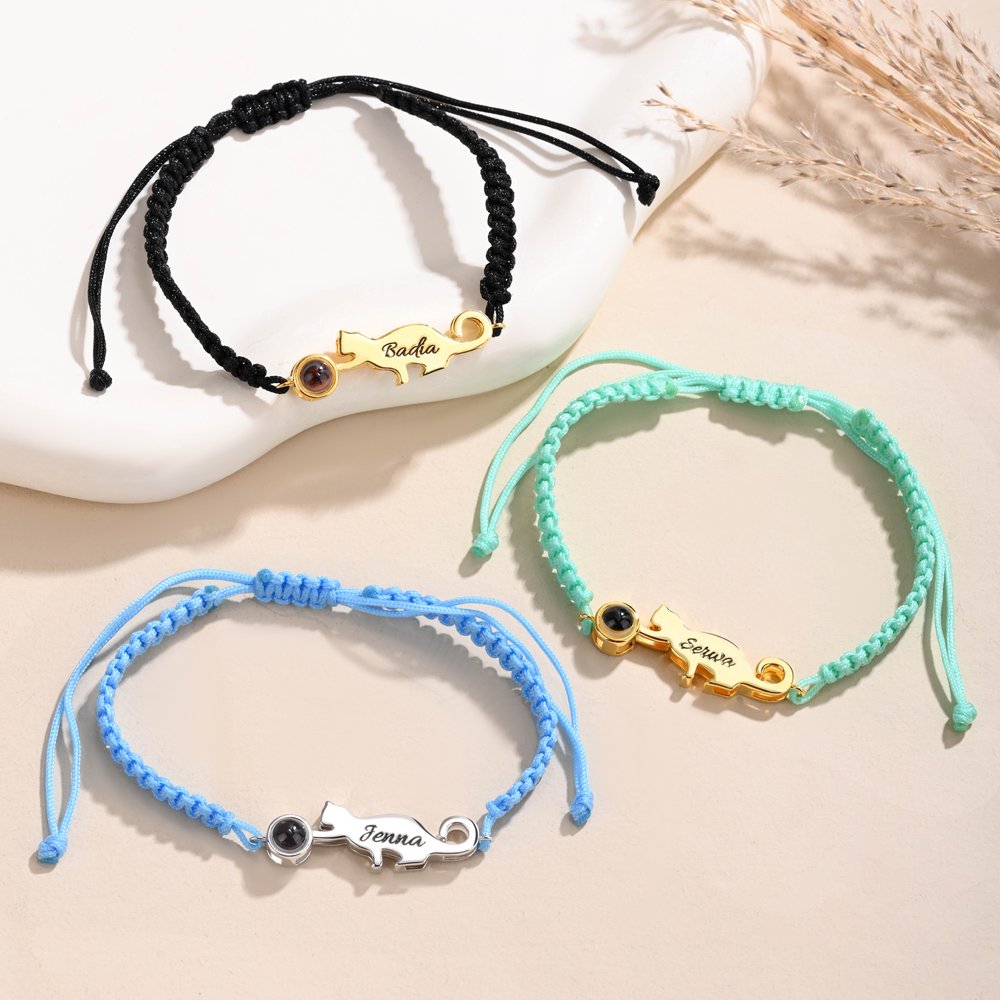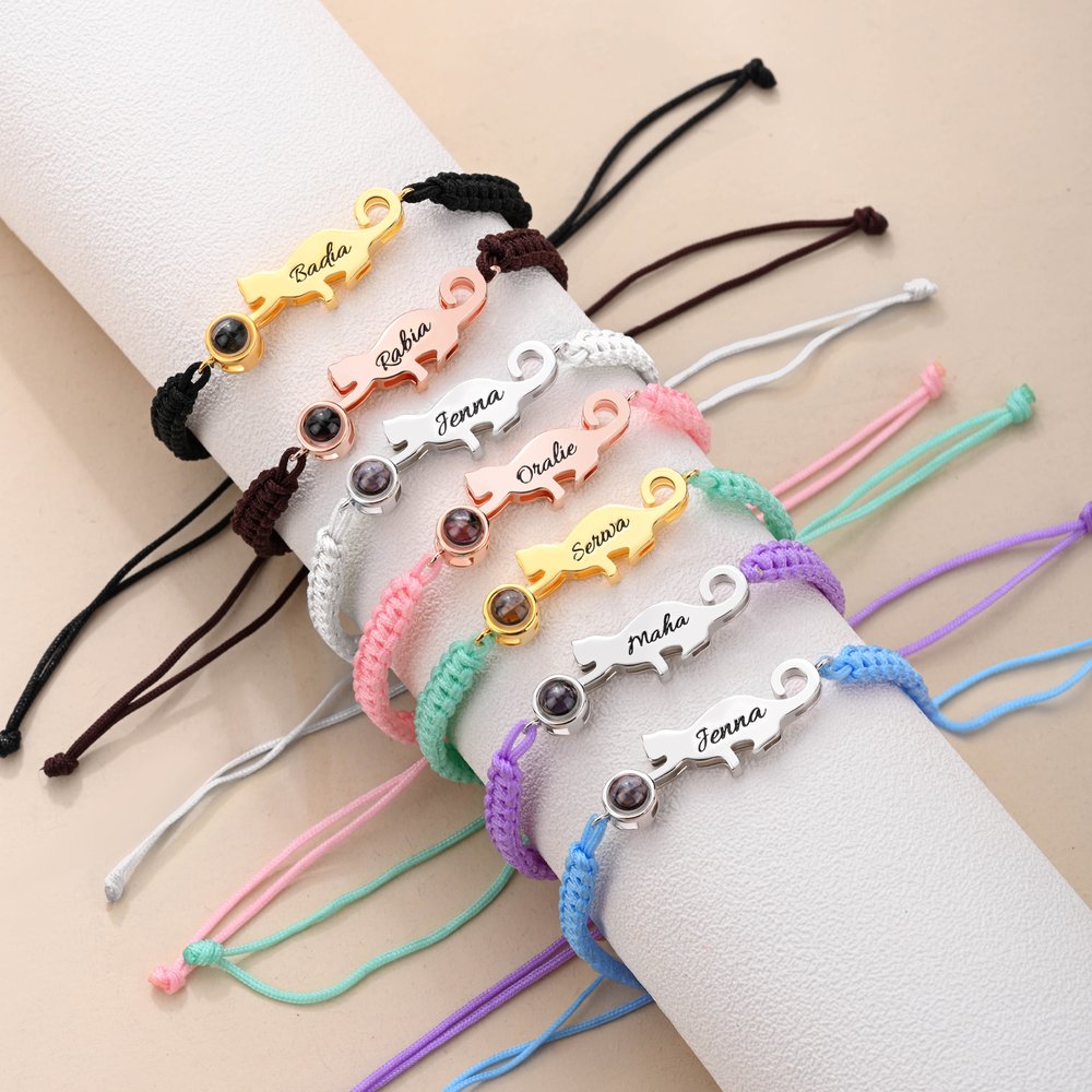 Valitsemme korkealaatuisen punotun narun ja messinki- ja platinamateriaalit varmistaaksemme jokaisen rannekorun kestävyyden ja mukavuuden. Punotussa osassa käytetään ensiluokkaista kangasta, joka on pehmeää ja ei ole helppo kulua, joten se sopii pitkäaikaiseen käyttöön. Projektio-osa on valmistettu hienosta käsityötaidosta ja siinä voi näyttää räätälöidyn valokuvasi.