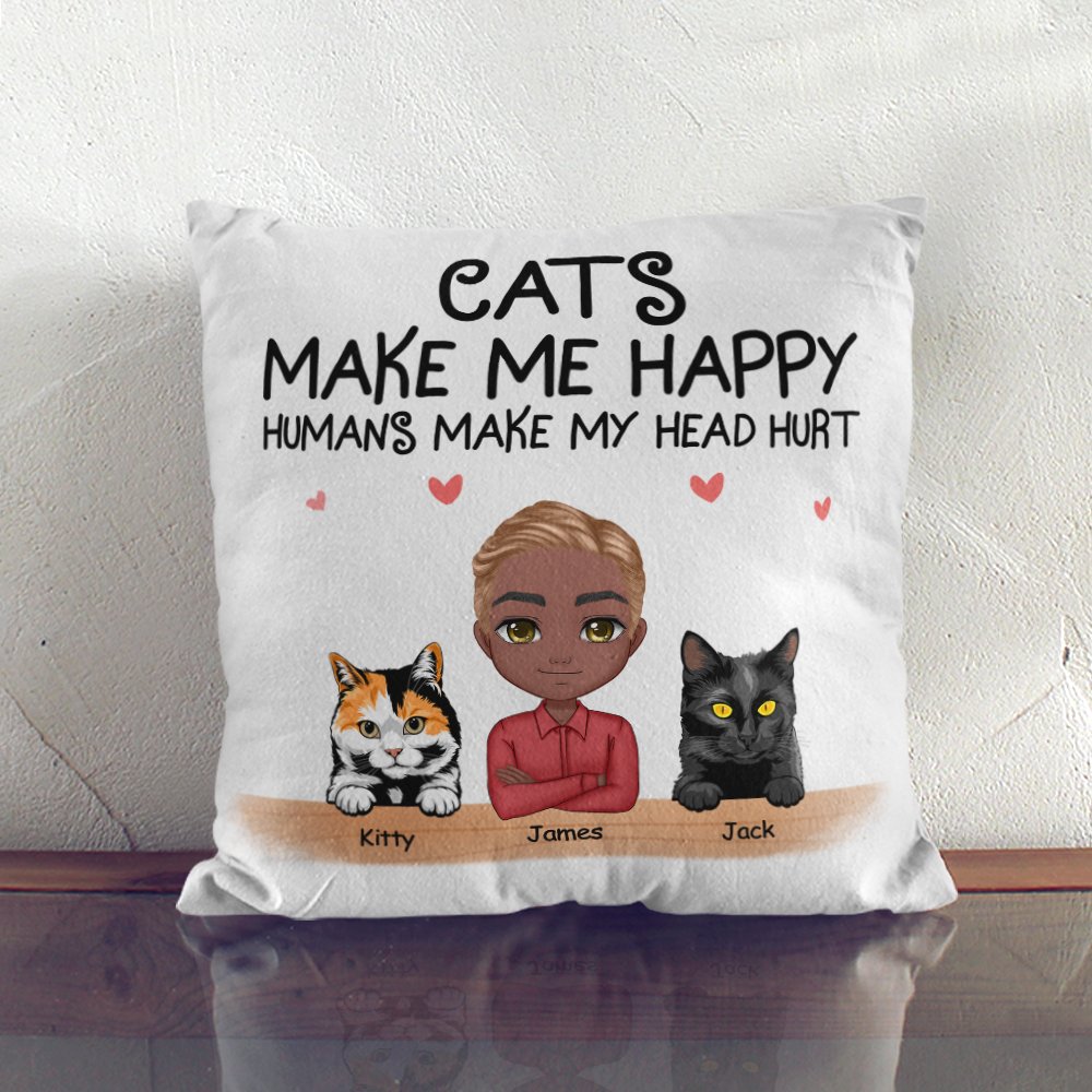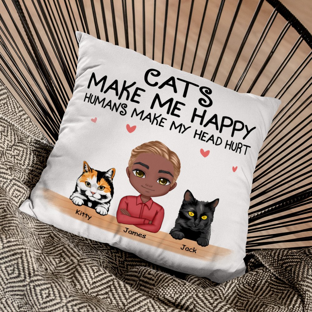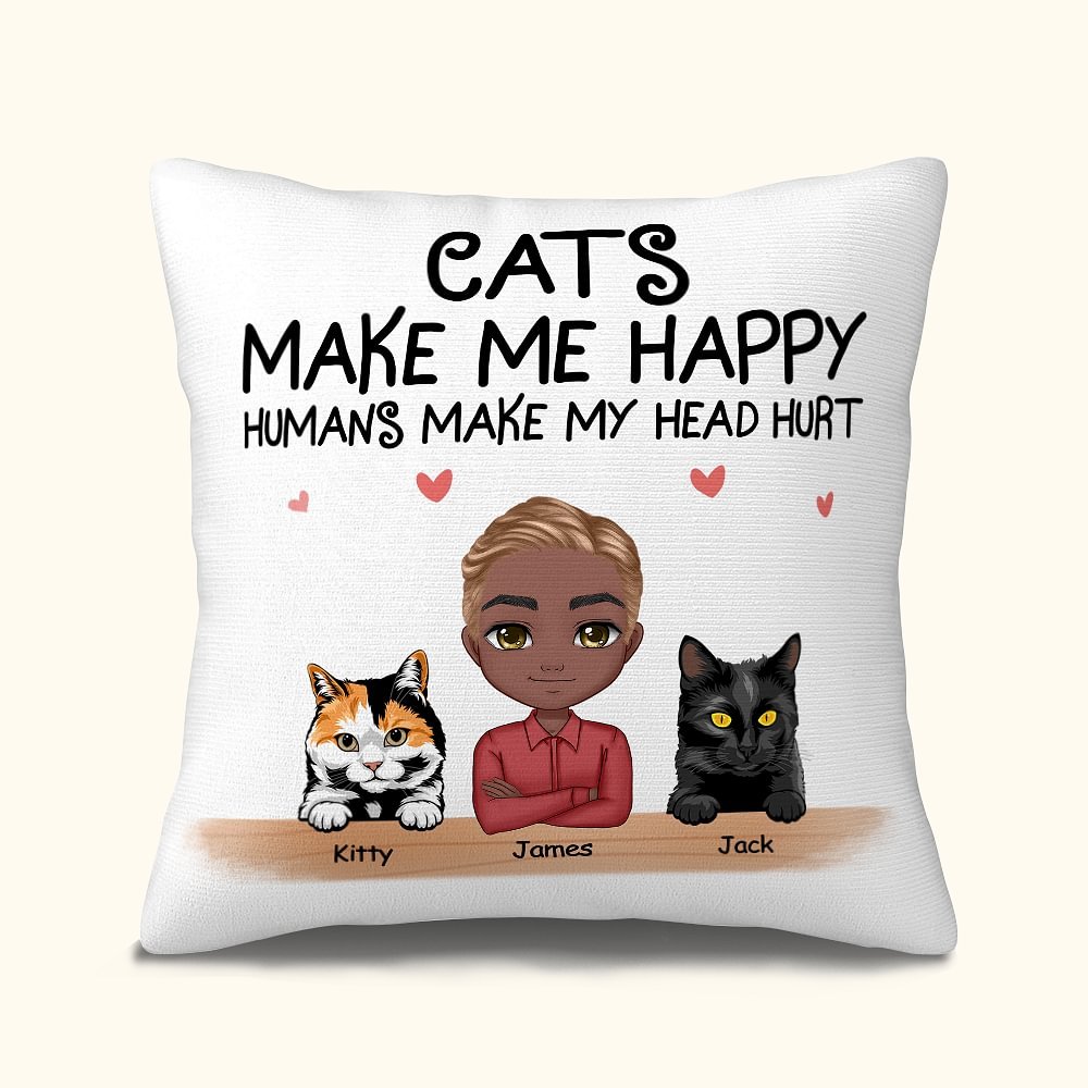 The pillow cover prints the words "CATS MAKE ME HAPPY HUMAN MAKE MY HEAD HURT" to express love for cats, and it can be customized with man's name, appearance, cats' breeds and names to form a unique one to attract cat lovers who love playful and whimsical home decor.