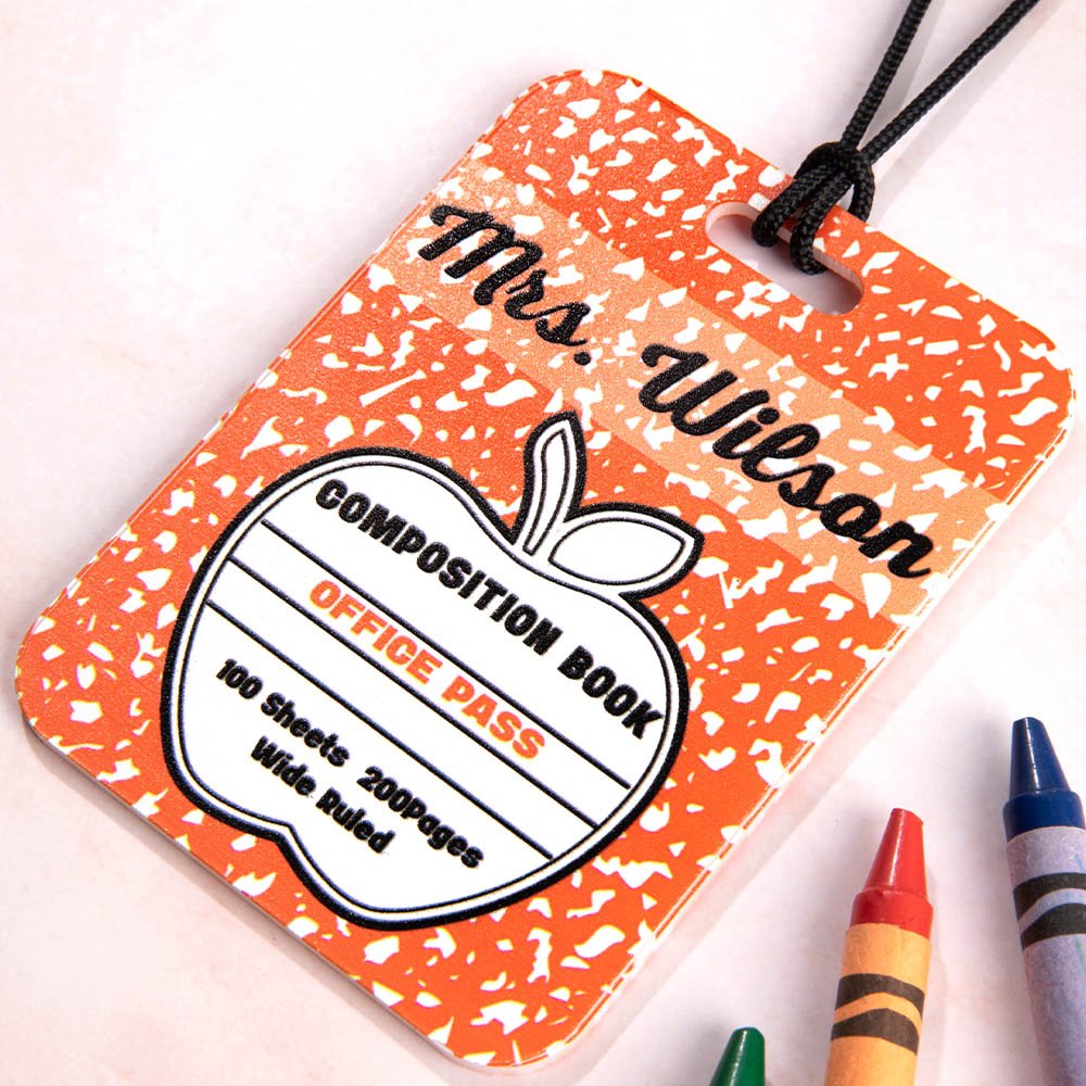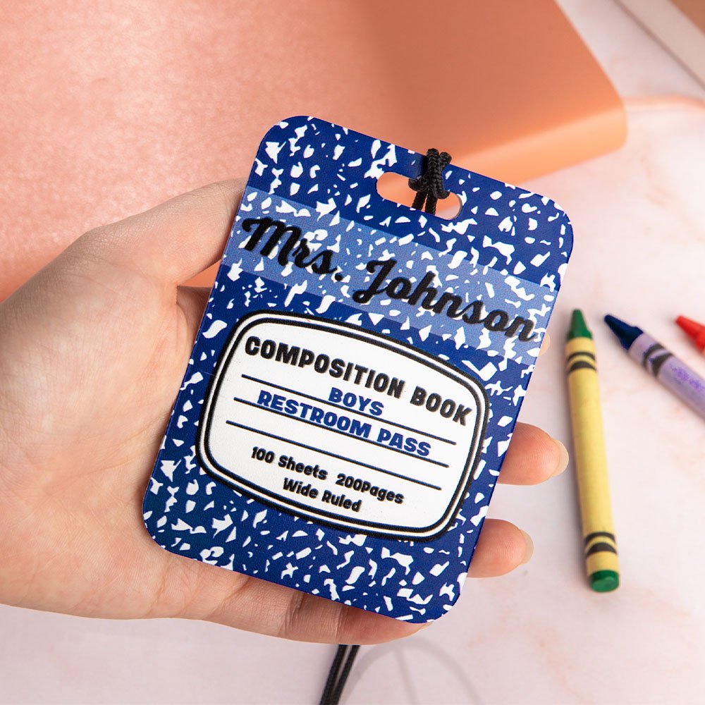 This pass features a vibrant composition notebook or apple design, available in a variety of styles and colors for you to choose from, personalize them with your name or custom text for extra uniqueness. These hall passes are not only practical and fun, but also add a touch of personality to your classroom.