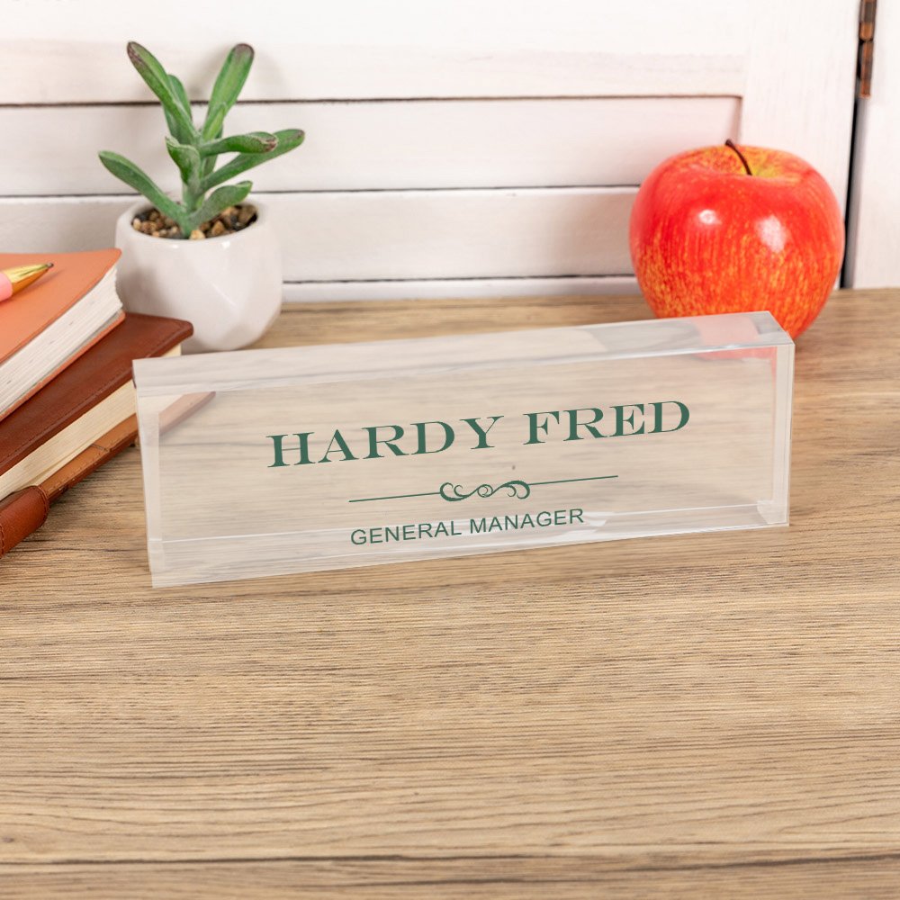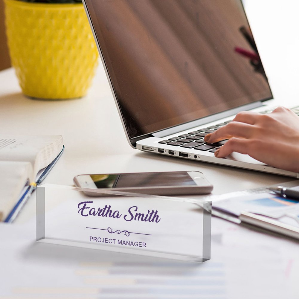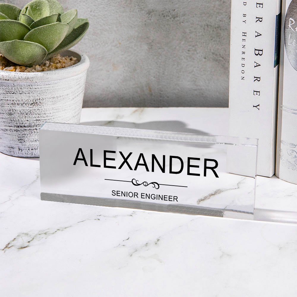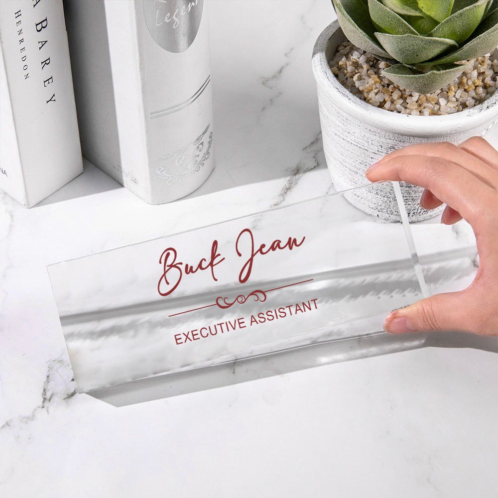 Tämä nimikyltti on valmistettu korkealaatuisesta läpinäkyvästä akryylimateriaalista, joka pystyy näyttämään tiedot myös heikossa valaistuksessa. Kehittynyt painotekniikka tekee fontista selkeän ja kauniin, kestävän, ja suorakulmainen muotoilu voidaan sijoittaa turvallisesti erilaisille tasaisille pinnoille, mikä lisää tyylikästä ja modernia charmia toimistopöydälle.