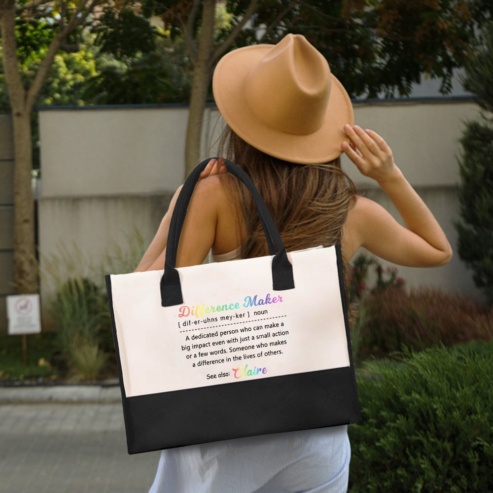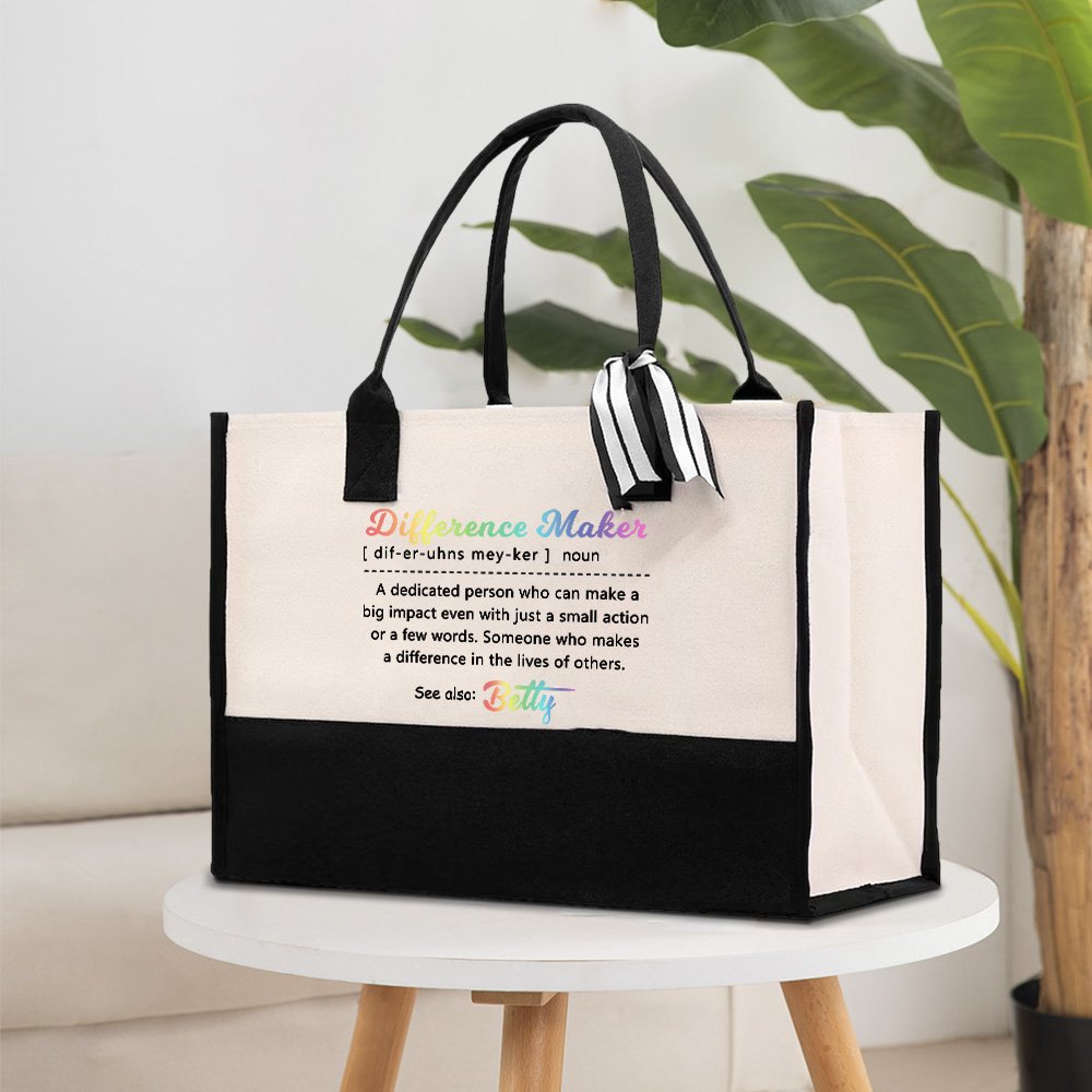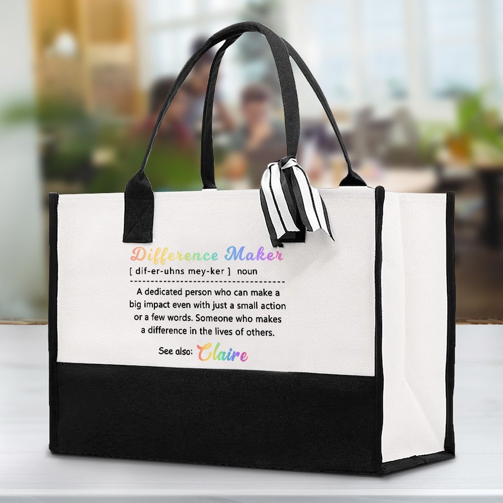 Kangaskassissa on värikkäät sanat "Difference Maker" ja yksityiskohtainen määritelmä, joka kuvaa omistautunutta henkilöä, joka voi saada aikaan suuren vaikutuksen jopa vain pienellä teolla tai muutamalla sanalla. Tämä muotoilu ei ole vain kaunis, vaan se toimii myös inspiraation ja motivaation lähteenä. Henkilökohtainen nimimuotoilu antaa tälle eron tekijälle konkreettisen muodon.