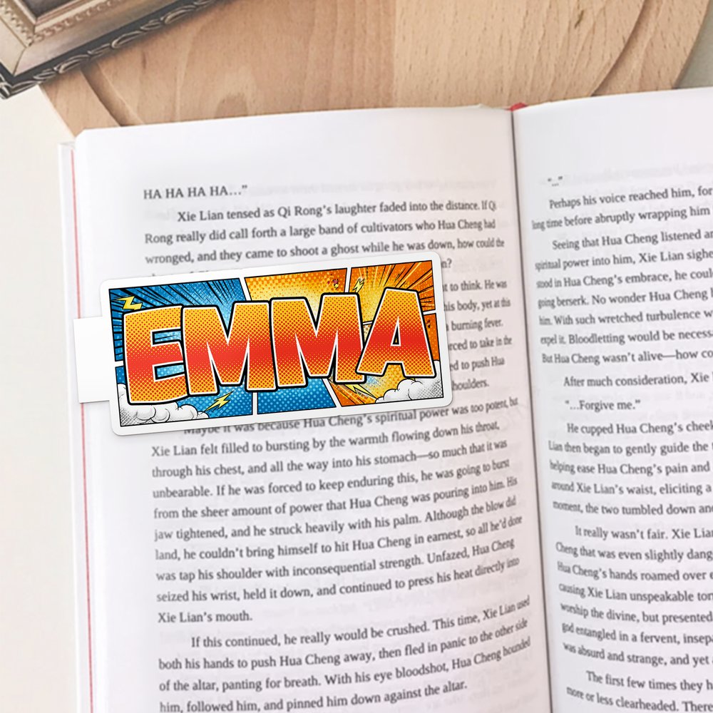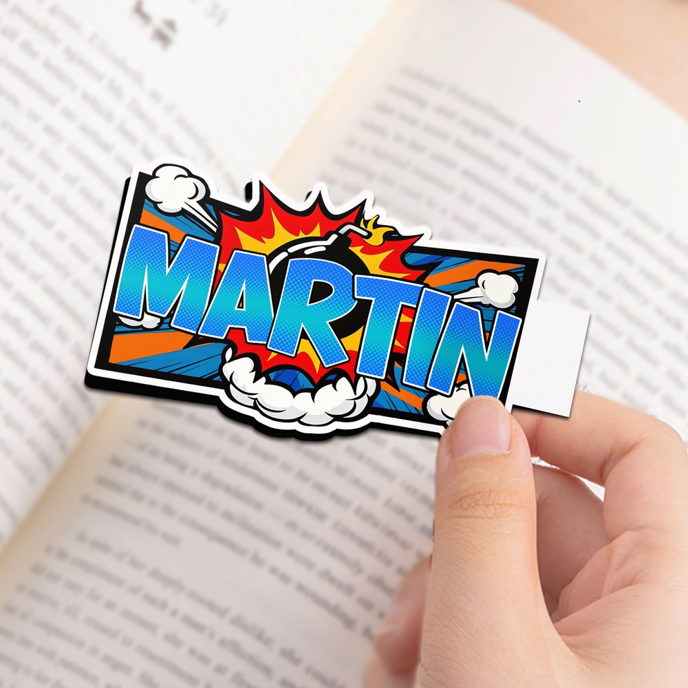 Siinä on amerikkalainen sarjakuvaestetiikka, jossa on kolme taustakuviota - polkka-pisteet, puhekuplat ja paneelien reunukset - yhdistettynä kahteen vastakkaiseen kirjaintyyliin. Nimelläsi muokattavissa oleva muotoilu muistuttaa sarjakuvamaisia keskustelukuplia ja antaa kirjanmerkille leikkisää charmia ja trendikästä ilmettä.