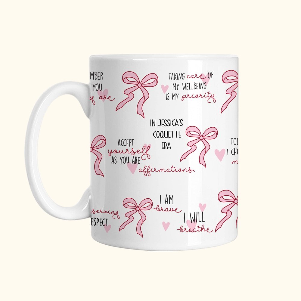 This ceramic mug features a coquette bow design and some biblical messages that showcase female beauty and individuality. There are words such as "I deserve happiness," etc. on the mug to encourage the recipient to maintain a positive attitude towards life but also to convey the sincere feelings of the giver. Customizable texts make this gift even more special.