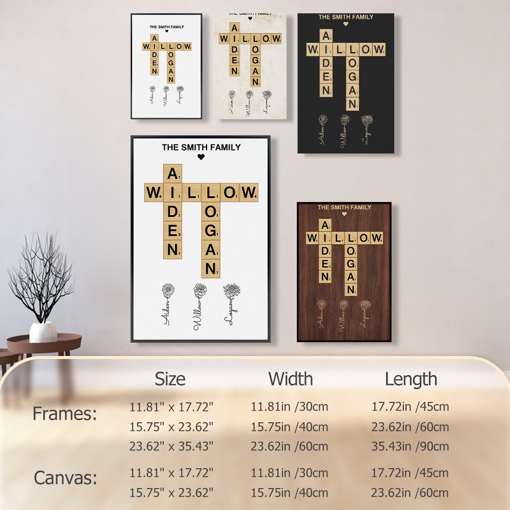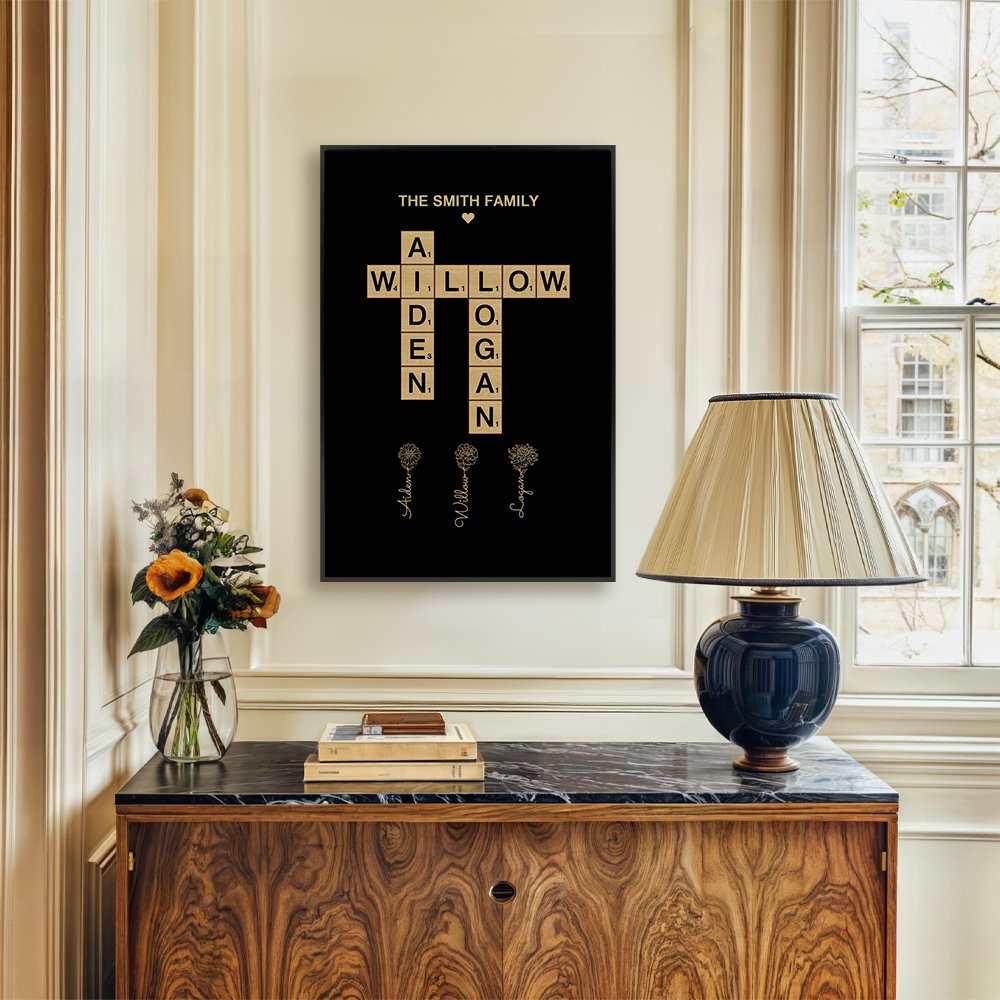 Tässä ainutlaatuisessa taideteoksessa on henkilökohtainen ristisanatehtävä, jossa on perheenjäseniä, jotka on yhdistetty toisiinsa hauskasti ja luovasti. Voit lisätä perheesi nimet ja jopa mukautetun otsikon, kuten "Johnsonin perhe", mikä tekee siitä sydäntälämmittävän lisän kotiisi.
