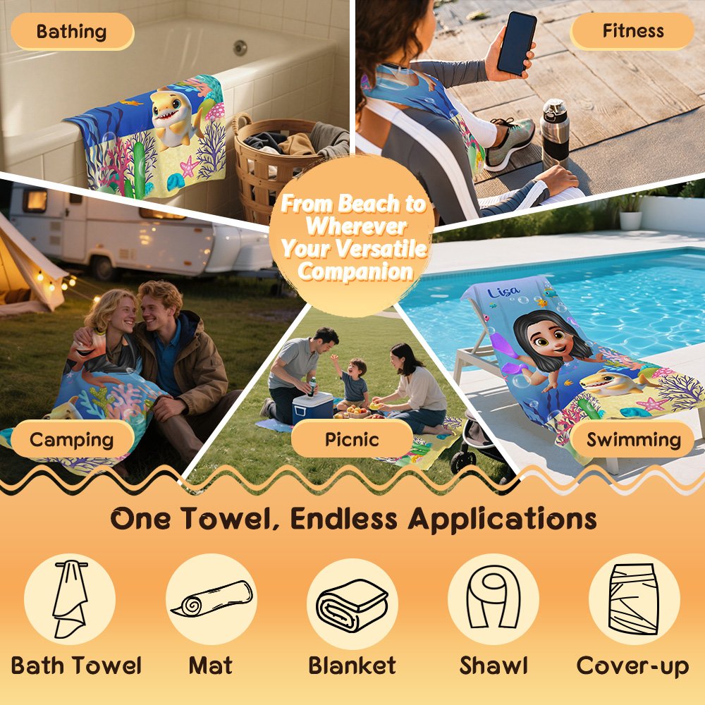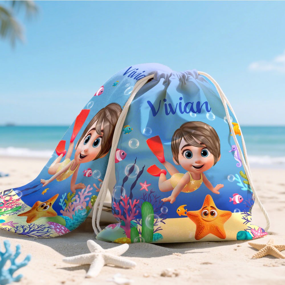 Tässä rantapyyhkeessä on söpöjä lasten sukelluskuvia ja erilaisia merieläimiä, kuten delfiinejä, kilpikonnia ja pellekaloja. Taustalla on myös runsaasti merellisiä elementtejä, kuten koralleja ja merilevää, jotka luovat unenomaisen vedenalaisen maailman. Henkilökohtaisen nimen räätälöintitoiminto tekee jokaisesta rantapyyhkeestä ainutlaatuisen, mikä sopii hyvin lasten persoonallisuuden osoittamiseen.