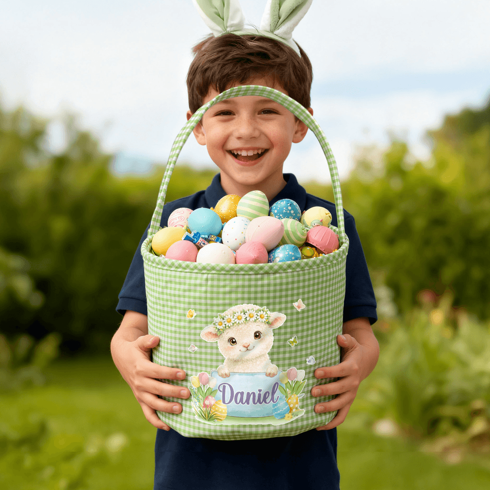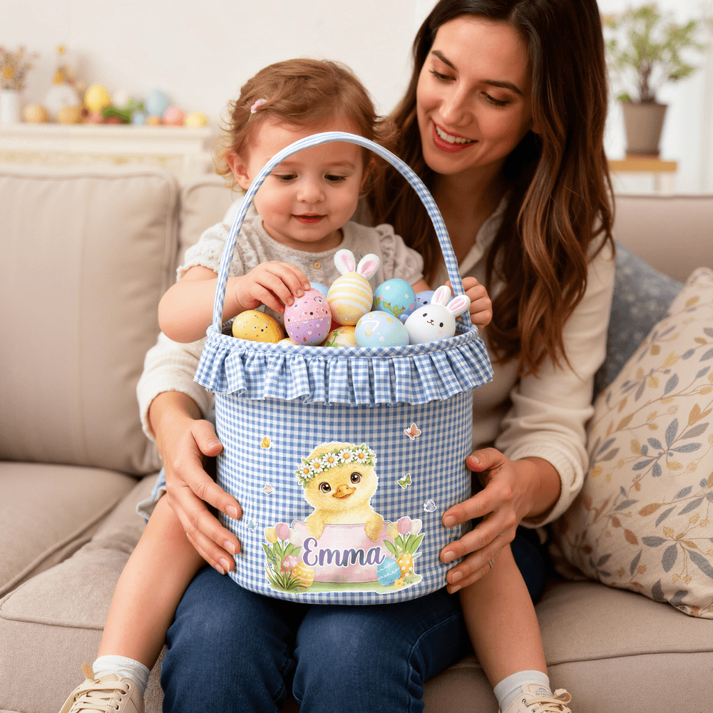 Tässä korissa on suloisia eläinhahmoja, kuten pääsiäispupu ja Highland Cow, koristeltu pääsiäismuna-elementeillä ja mukautetuilla nimillä, ja siinä on kirkkaat ja eloisat värit, jotka pursuavat juhlallista iloa. Henkilökohtainen nimi tekee siitä tavallisesta esineestä ainutlaatuisen pääsiäisherkun lapsille.