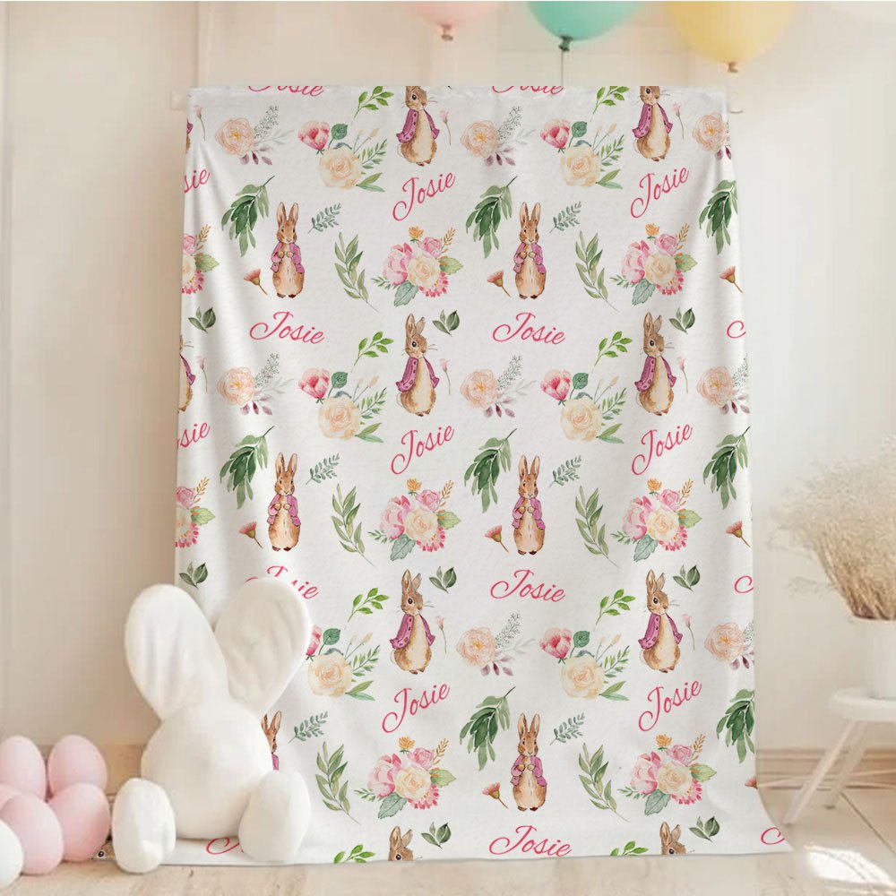 Tässä peitossa on söpöjä vaaleanpunaisia tai sinisiä pupukuvioita, joita koristavat vihreät lehdet ja kukat, mikä antaa sille tyylikkään ja ihastuttavan ulkonäön. Lisäksi voit muokata sitä lisäämällä siihen vauvasi nimen, jolloin saat aikaan ainutlaatuisen peiton juuri pikkuisellesi.