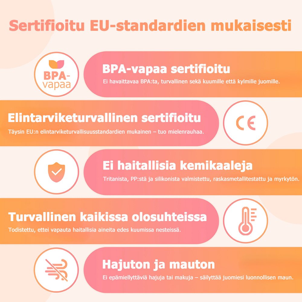 Tritan-ympäristöystävällisestä muovista valmistettu pullo ei sisällä haitallisia aineita, mikä takaa lasten turvallisuuden. Sen iskunkestävä rakenne takaa pitkäaikaisen suorituskyvyn, joten se on särkymätön päivittäisessä käytössä.