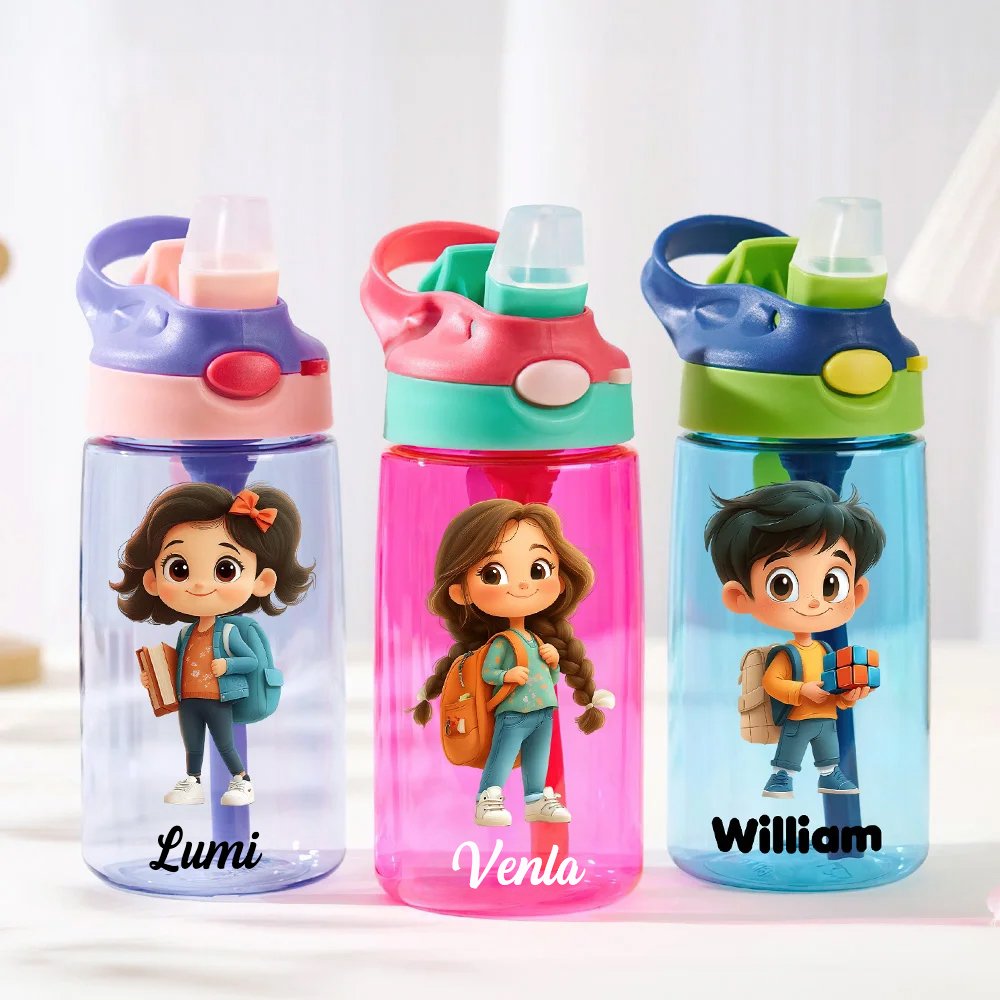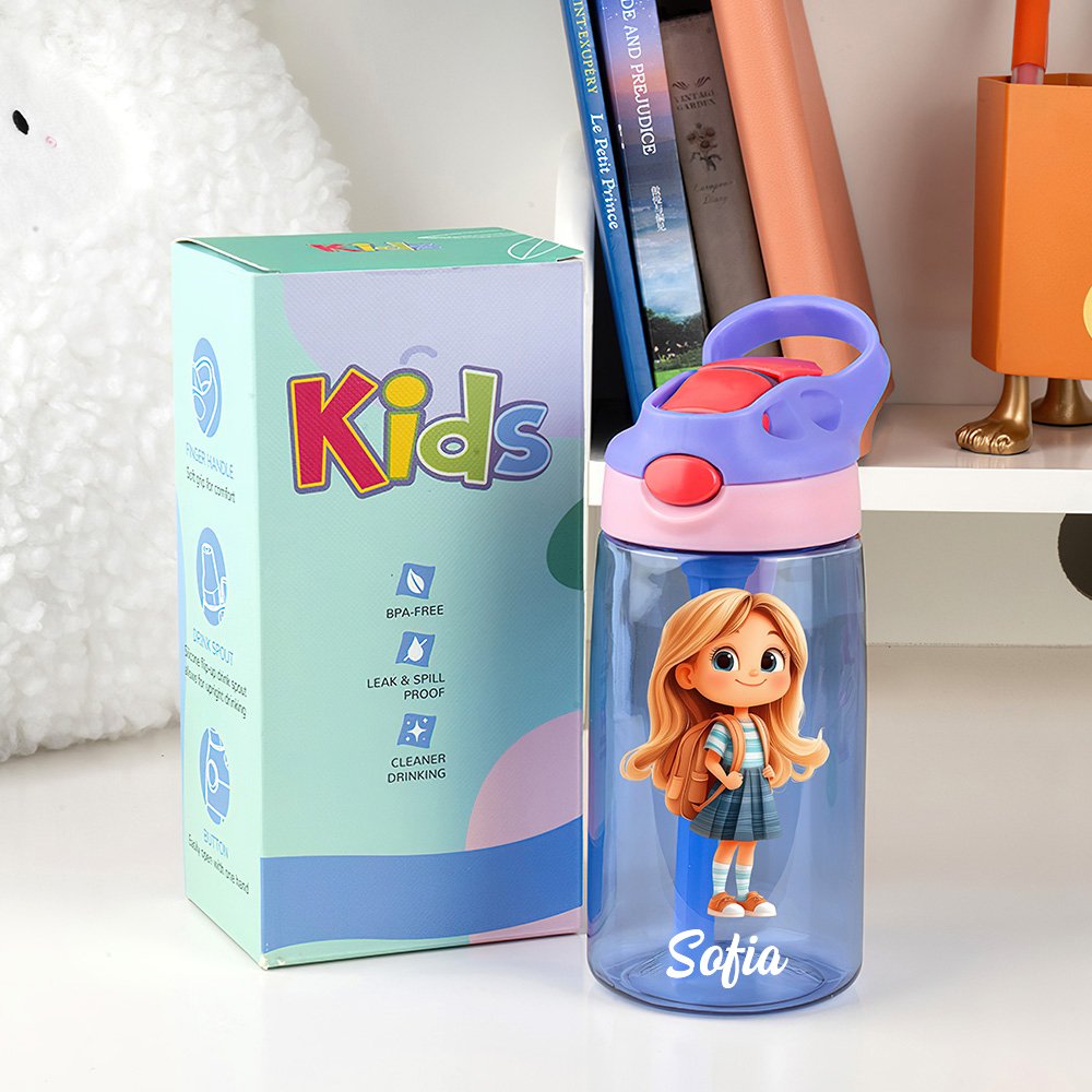 Tämä vesipullo on räätälöitävissä erilaisilla sarjakuvakuvoilla, jotka heijastavat lapsen ainutlaatuista persoonallisuutta. Voit valita eri fontteja ja värejä sekä painattaa lapsen nimen, jolloin siitä tulee unohtumaton muisto heidän lapsuudestaan. Vesipullo on saatavilla neljässä kirkkaassa värissä: sininen, punainen, vihreä ja violetti, ja se tulee varmasti olemaan kaikkien lasten suosikki.