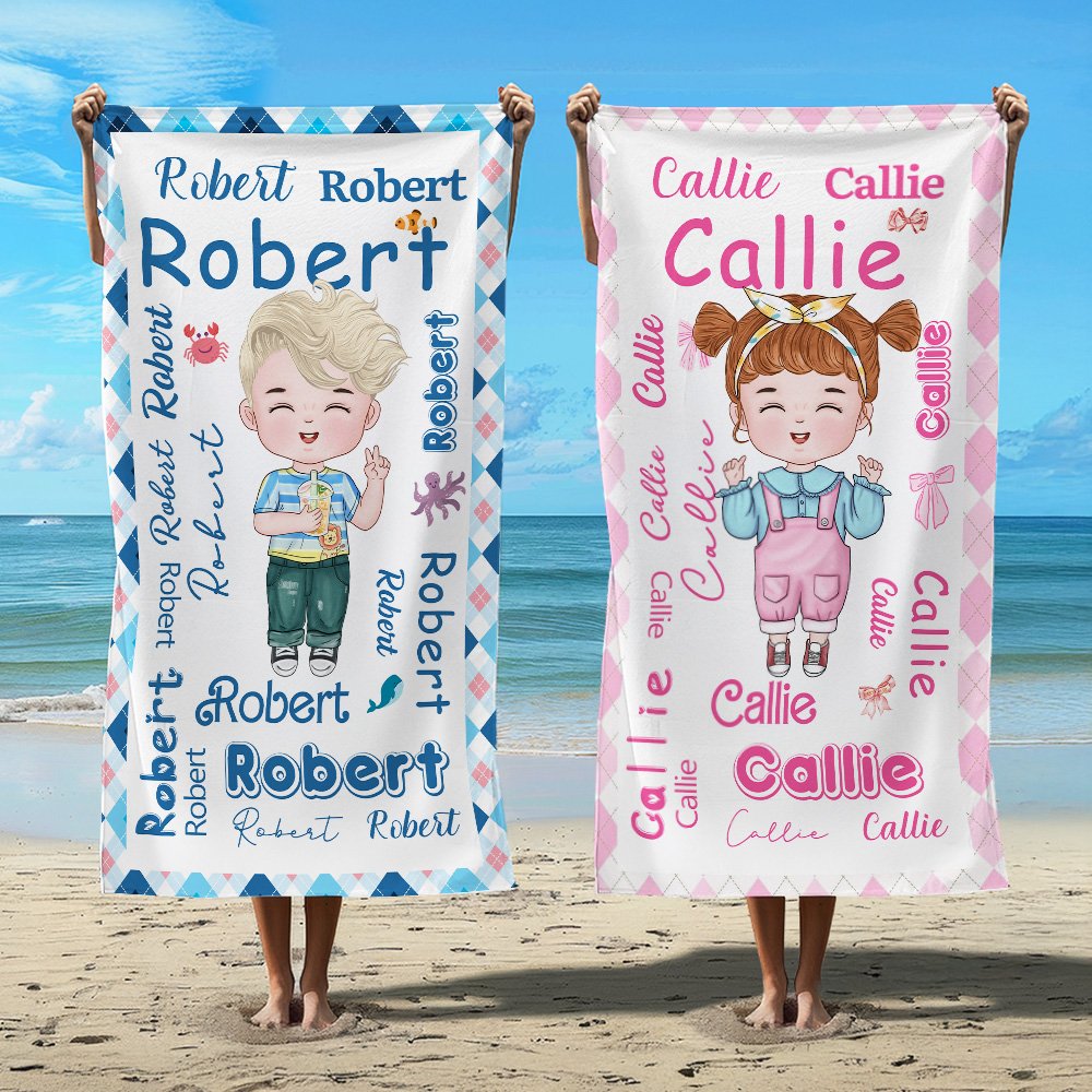 Tässä rantapyyhkeessä on sanapilvi-nimi ja söpö sarjakuvahahmokuvio. Käyttäjät voivat muokata sukupuolta, kampausta, hiusten väriä, vaatteita, ihonväriä ja silmien väriä. Valittavana ei ole vain 8 timanttiruutukuviota, vaan voit valita myös rusetti- tai merielämäkuvion, joka on täynnä lapsenomaista viattomuutta ja josta lapsesi varmasti pitävät.