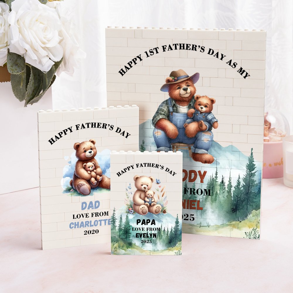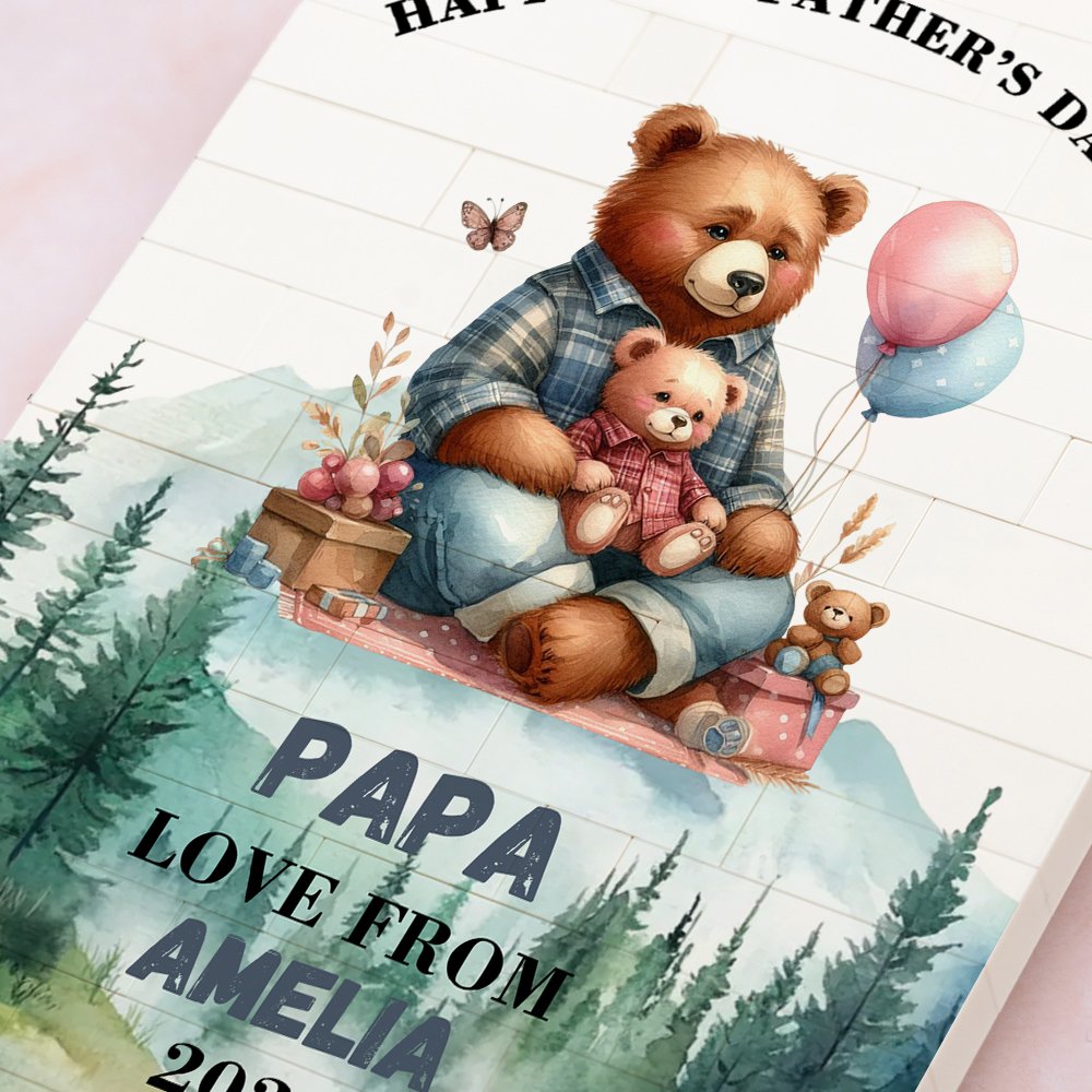 Näissä rakennustiilipalapeleissä on graafinen muotoilu, jossa elävä grafiikka ja lämpimät sanat yhdistyvät ja joka välittää lämpöä jokaisella silmäyksellä. Valittavana on kaksi otsikkoa, ja voit mukauttaa haluamasi otsikon. Lisäksi söpö halaileva sarjakuvakarhukuvio voidaan myös personoida isäsi nimellä ja lapsen nimellä, ja voit valita eri väreistä, jotta tästä tulee ainutlaatuinen lahja.