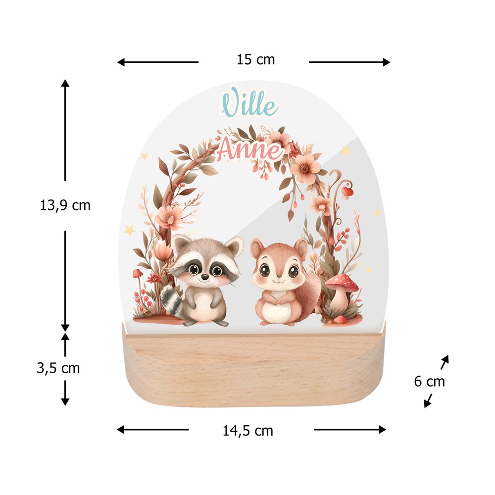Tässä akryyliyövalossa leikkii 42 söpöä eläintä metsäkaarien siimeksessä. Valitse yhden tai kahden eläimen asettelu ja lisää lasten nimet henkilökohtaistamalla. Lopputuloksena syntyy täysin oma lapsenikäiseen mielikuvitukseen uponnut unikkotuote.