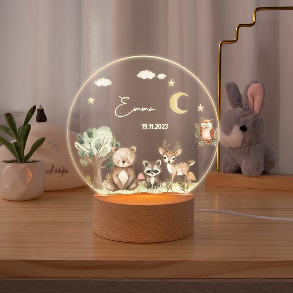 Yövalossa on suloisia eläinkuvioita kuten karhu hirvi pesukarhu ja pöllö. Puiden pilvien ja kuun ympäröimänä se luo metsämäisen ja rauhoittavan tunnelman. Valoon voidaan lisätä personoitu nimi ja teksti jolloin syntyy ainutlaatuinen sisustuselementti.