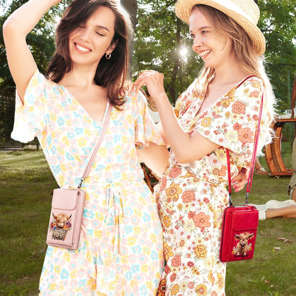 Henkilökohtainen söpö Highland Cow PU Nahka Crossbody laukku lompakko nimi äitienpäivä syntymäpäivälahja naisille