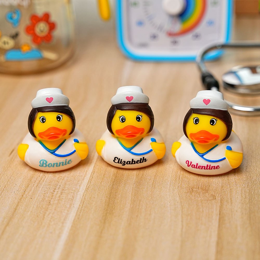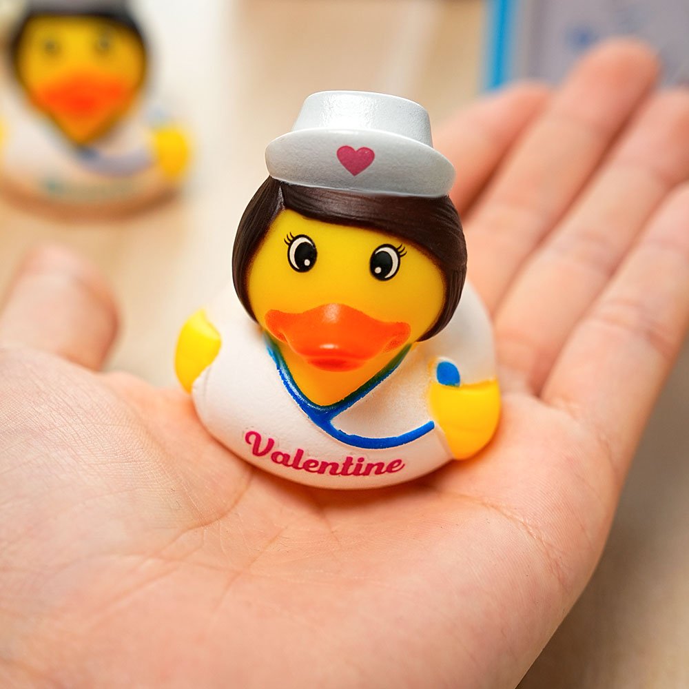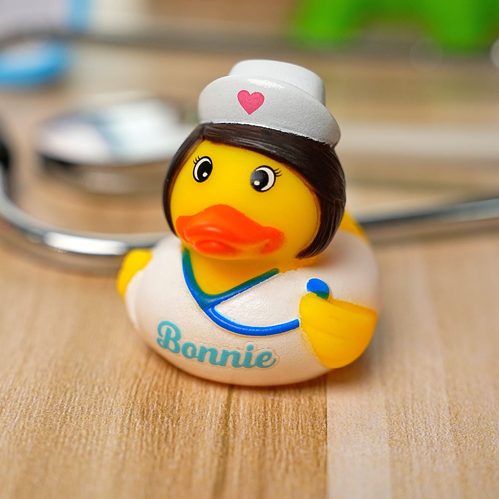 Tämä viehättävä sairaanhoitaja-kumiankka on täydellinen lahja elämäsi erityiselle sairaanhoitajalle. Tee tästä lahjasta vieläkin erikoisempi räätälöimällä siihen sairaanhoitajan nimi ja valitsemalla kolmesta nimiväristä.