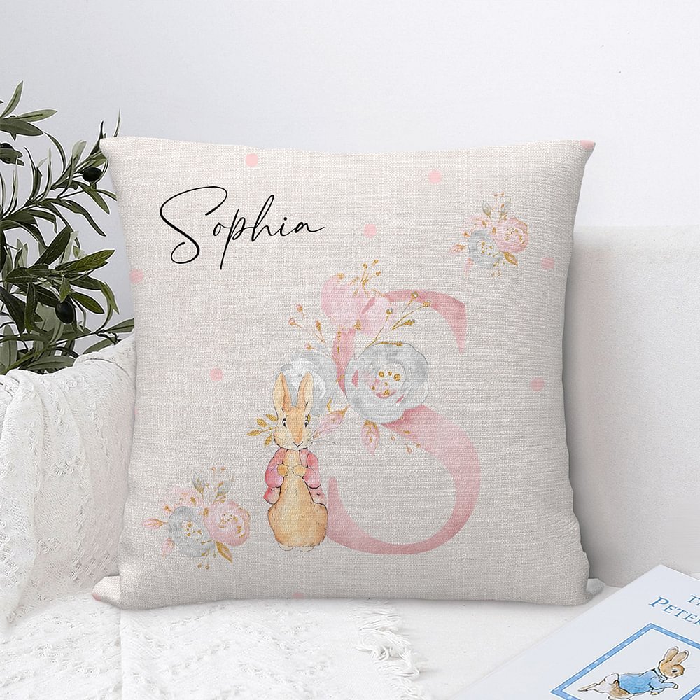 This throw pillow cover features a charming Peter Rabbit illustration combined with beautiful floral initials, making it an ideal gift for newborns. The personalized touch of adding the baby’s name conveys heartfelt wishes for the child’s future, symbolizing love, care, and blessings from the giver.