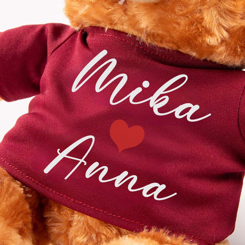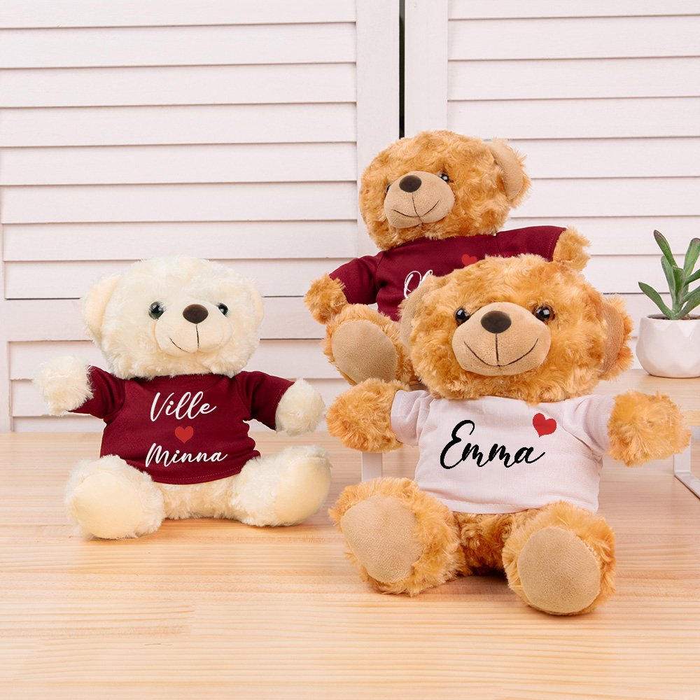 Tämä söpö täytetty karhu on saatavana valkoisena ja ruskeana. Se on pukeutuna paitaan tai huppariin sydämen kera, mikä tekee siitä täydellisen rakkauden symbolin. Voit personoida karhun yhdellä tai kahdella nimellä pariskunnalle tai omalle erityiselle, mikä tekee siitä aidosti ainutlaatuisen ja sydämellisen lahjan.