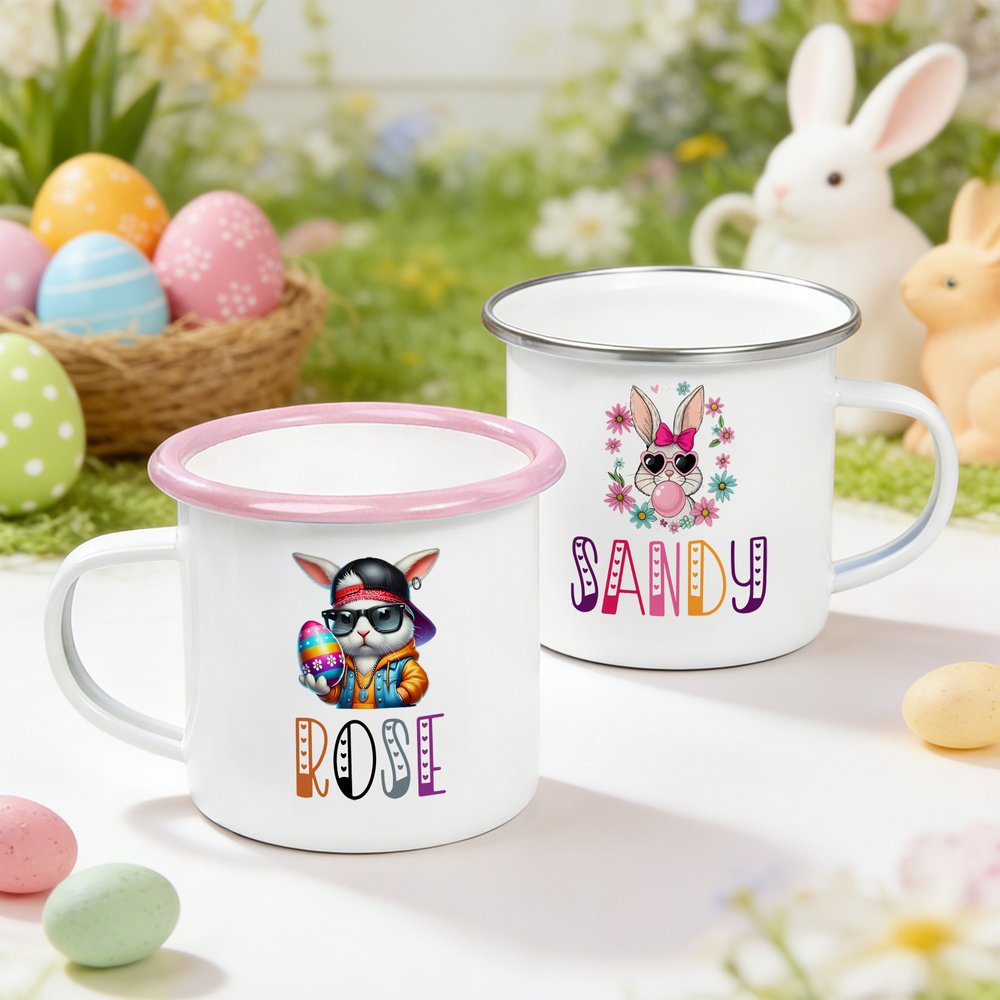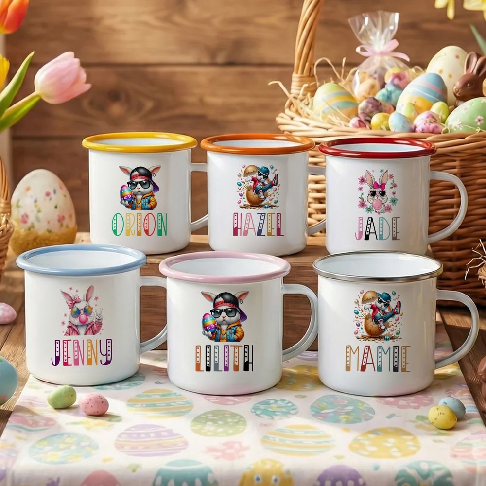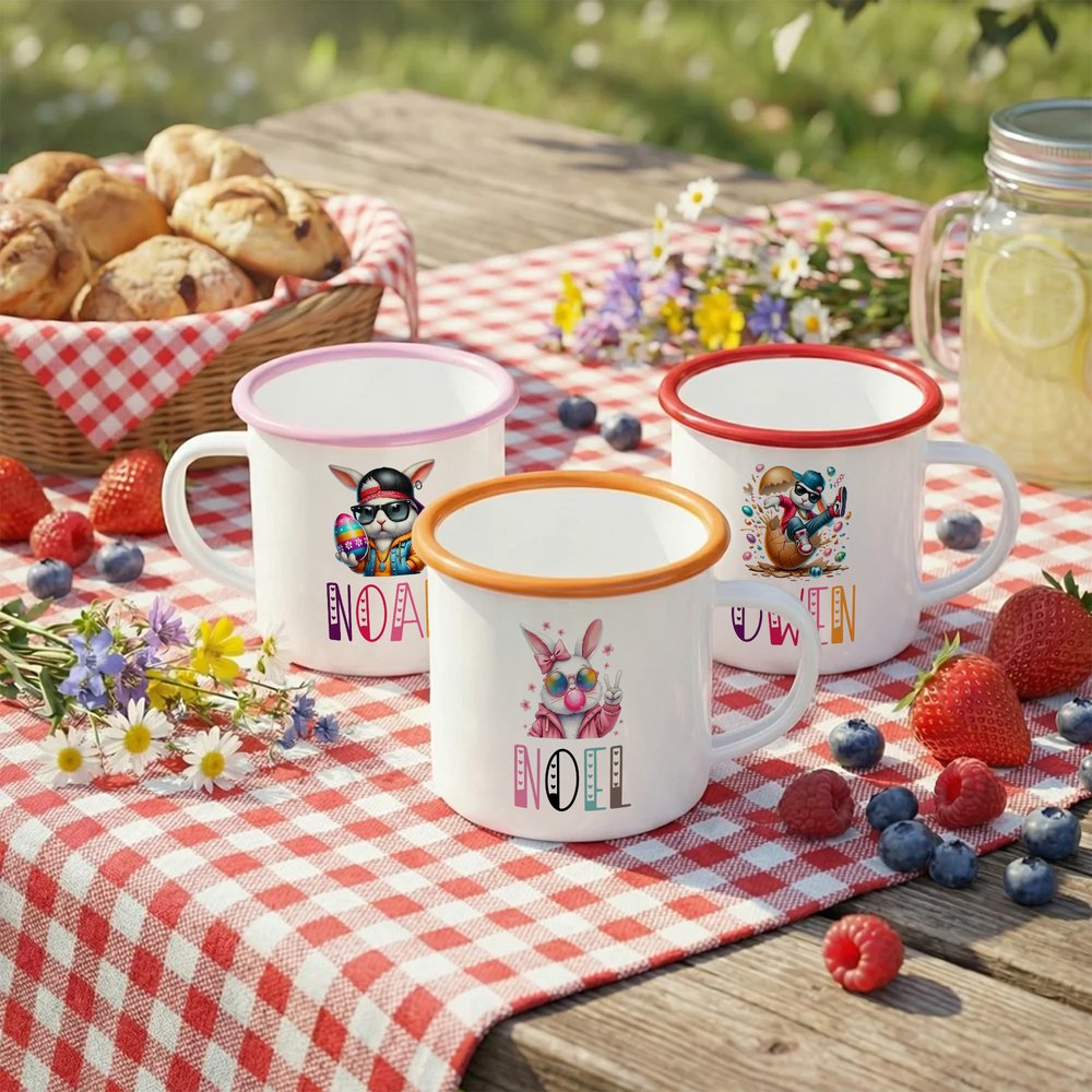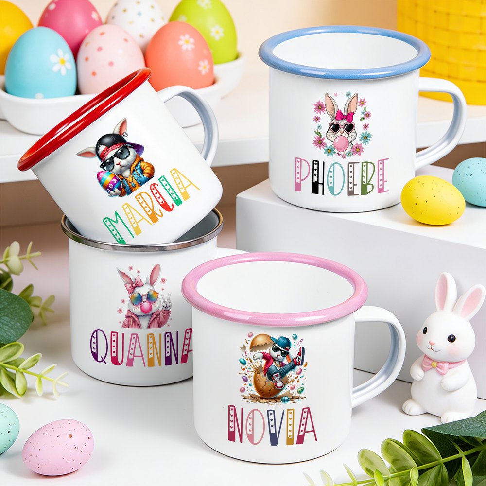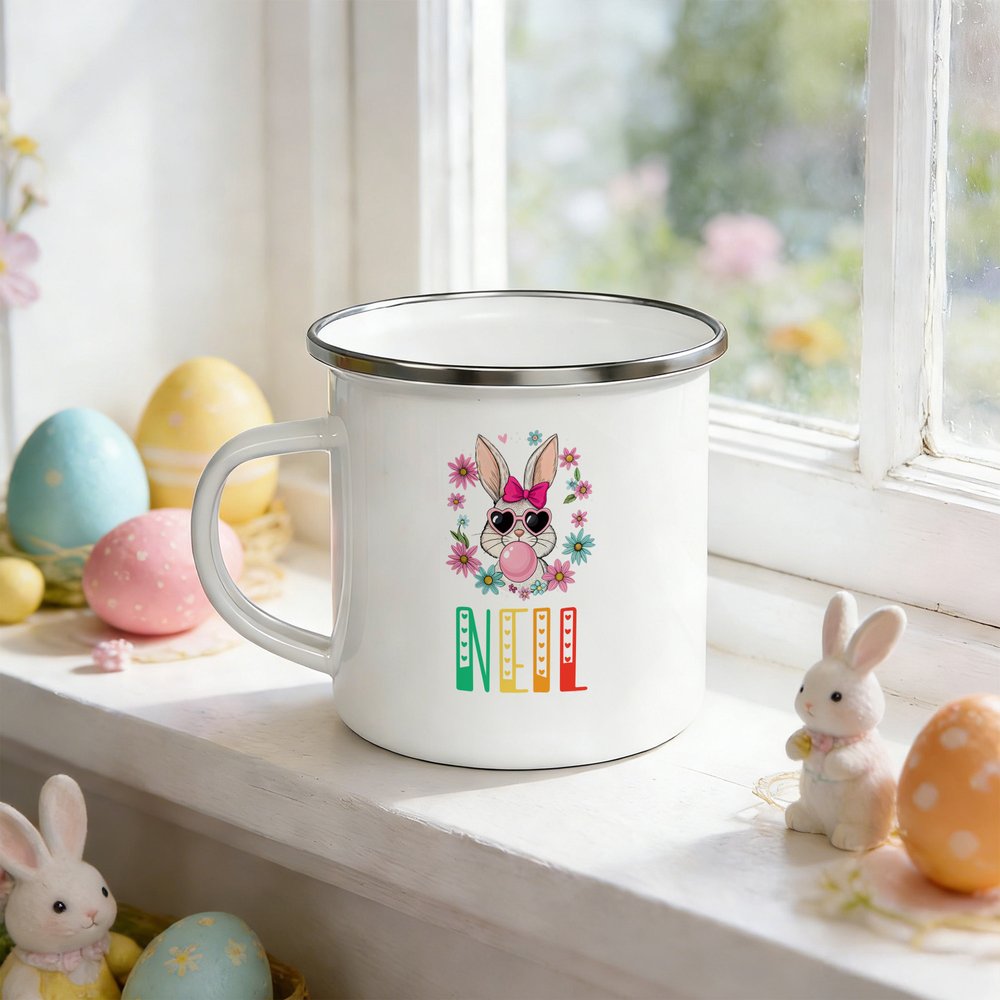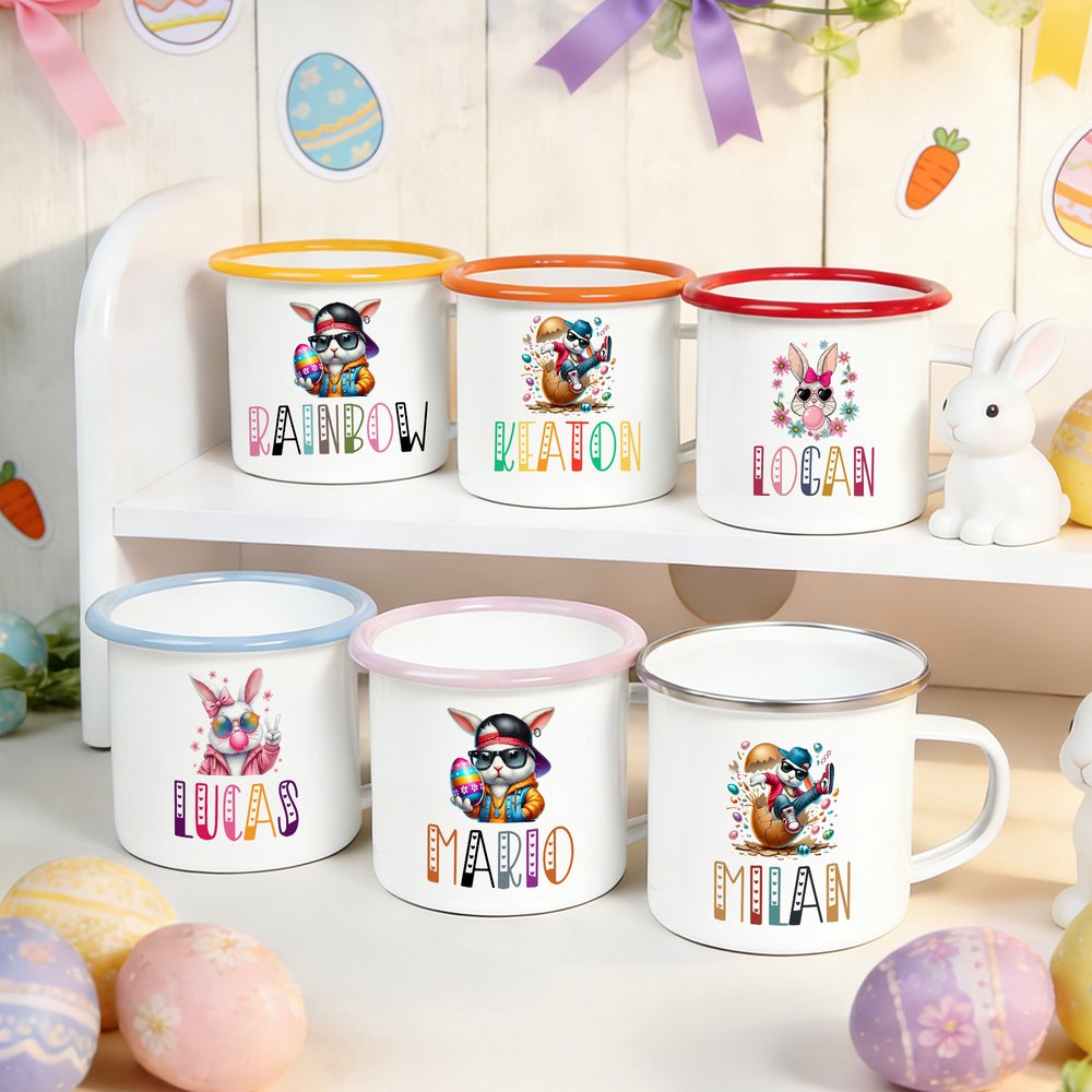 Tässä suloisessa emalimukissa on siisti pääsiäispupu, joka tuo pääsiäisjuhliin iloisen ja juhlavan lisän. Voit myös personoida sen lapsesi nimellä, jolloin siitä tulee ainutlaatuinen ja arvostettu muisto jokaista pääsiäistä varten.
