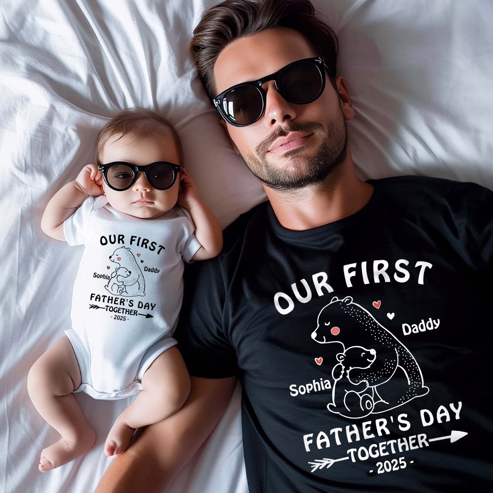 Vaatteemme on suunniteltu niin, että niiden suunnittelussa on söpö vanhempi-lapsi-karhu. Vauvan karhu on kietoutunut isän syliin, ja kuva on kauniisti lämmin ja kodikas, keinona ilmaista isän ja lapsen välistä rakkautta, ja juhlallisella tekstillä "Ensimmäinen isänpäivämme", joka tekee juhlallisesta ilmapiiristä vankemman ja lämpimämmän. Tarjoamme mahdollisuuden lisätä sinun ja lapsesi nimen vaatteen etupuolelle, mikä lisää henkilökohtaisen kosketuksen ja tekee vaatteesta merkityksellisemmän.
