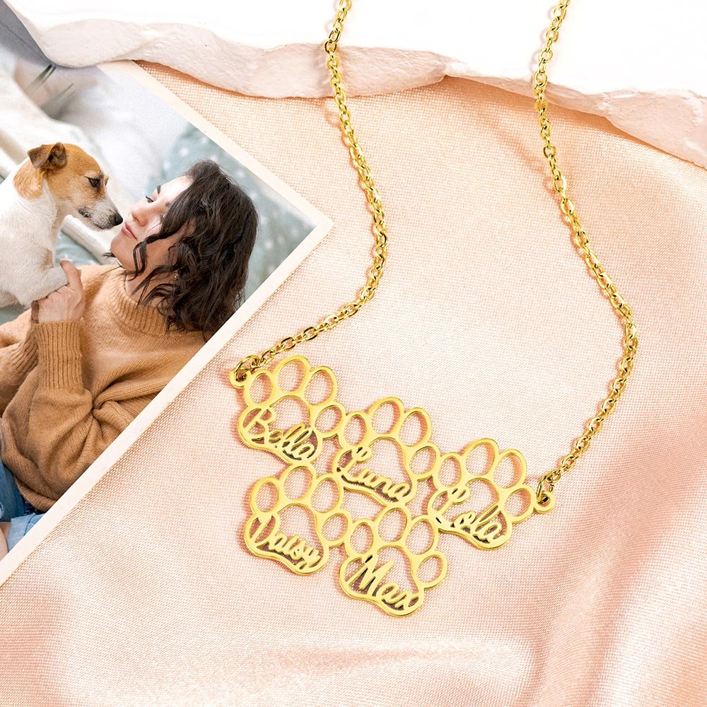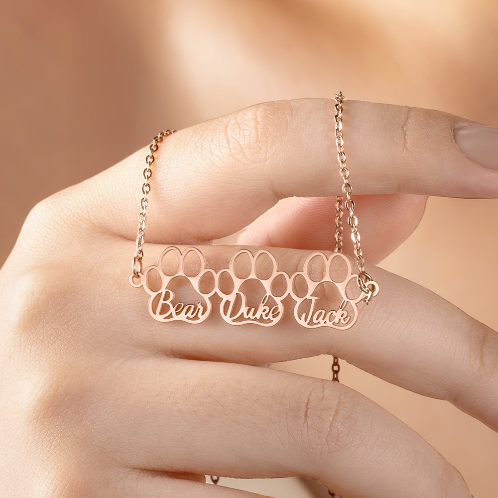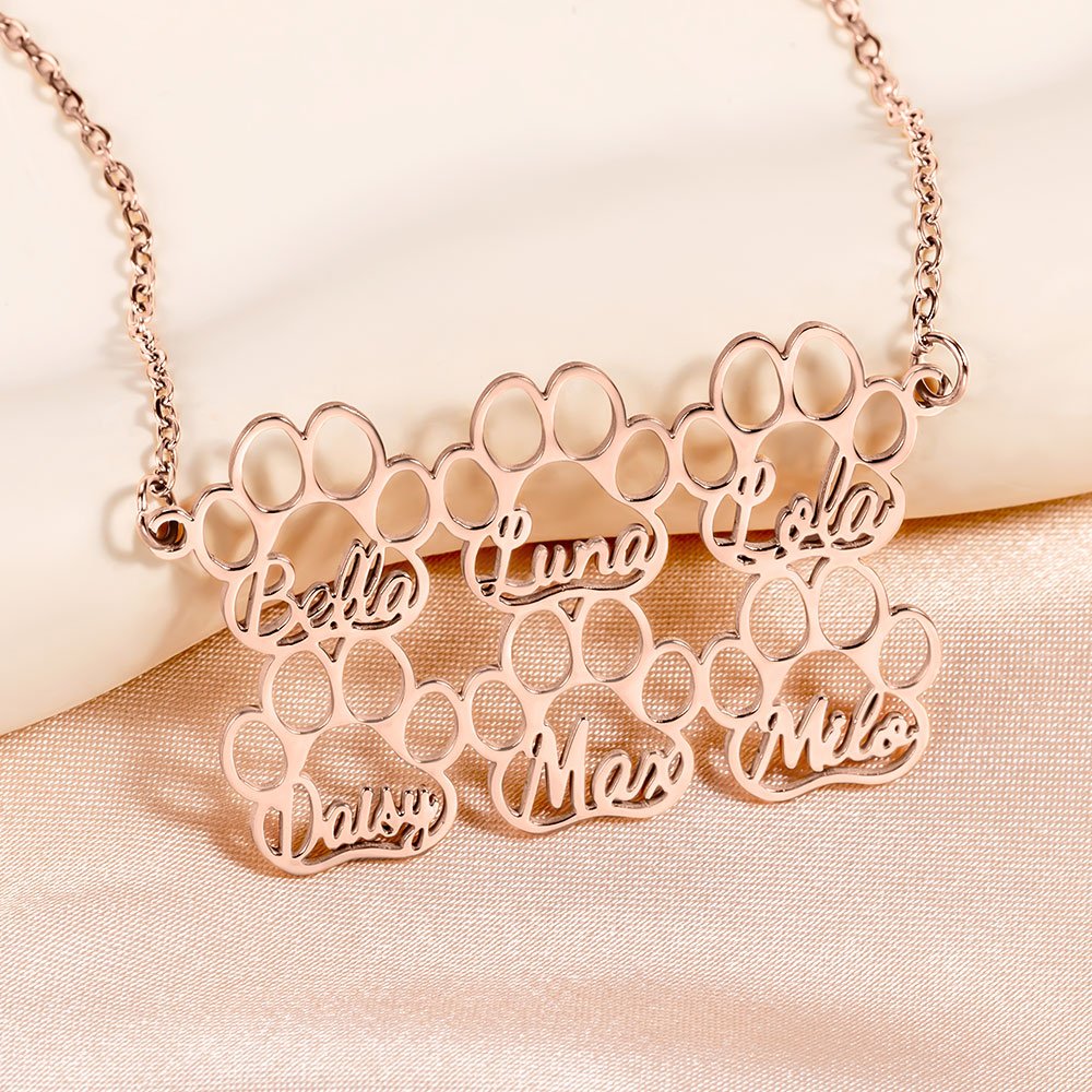 Tämä kaulakoru on suunniteltu enintään 6 tassunjälkeä, joissa on omat nimet. Jokainen tassunjälki symboloi yhtä rakkaista lemmikeistäsi.