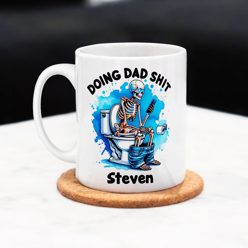Tässä valkoisessa mukissa on luuranko, joka istuu vessanpöntöllä matkapuhelin kädessään. Sen ympärillä on myös sininen akvarelliroiske-efekti, joka tekee koko kuvasta rennon ja humoristisen. "DOING DAD SHIT" on painettu yläreunaan, ja yksinoikeuden nimi voidaan räätälöidä alapuolelle. Olipa se sitten omaan käyttöön tai lahjaksi, tästä mukista voi tulla pöydän silmäänpistävin koriste, joka lisää huumoria elämään.